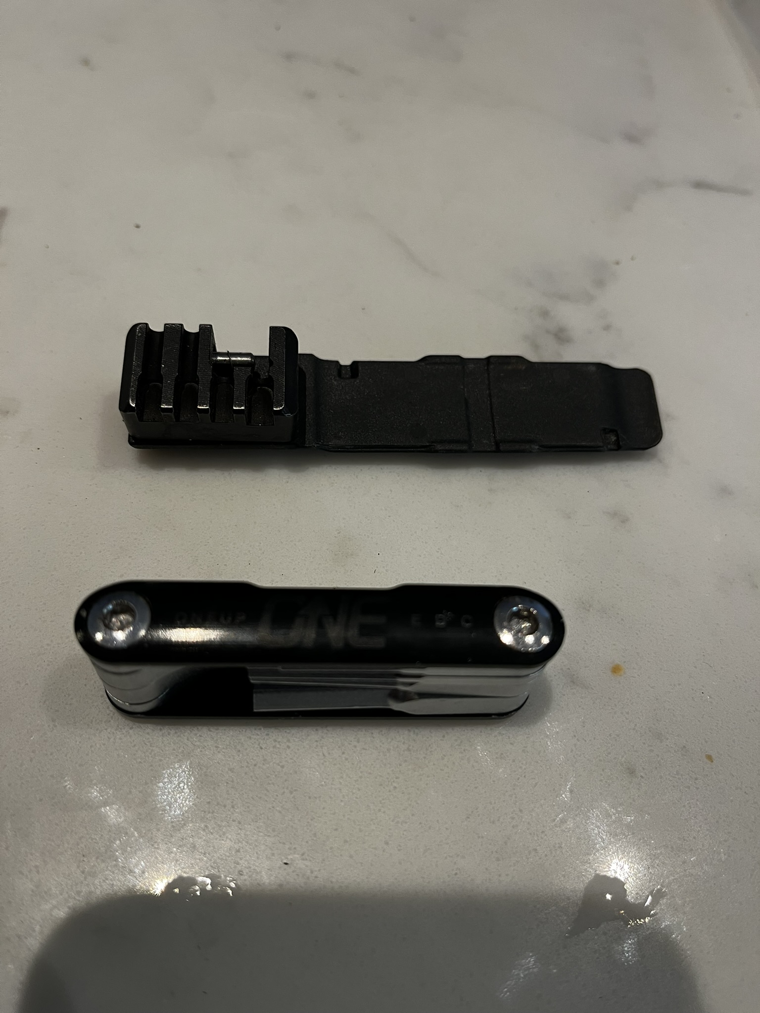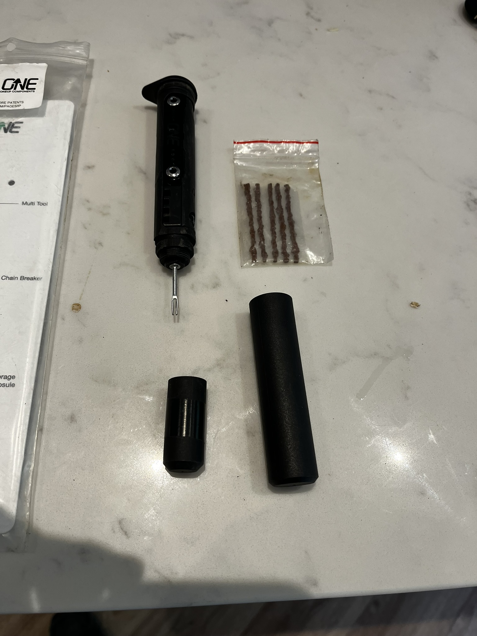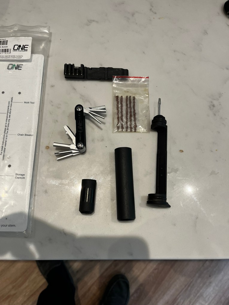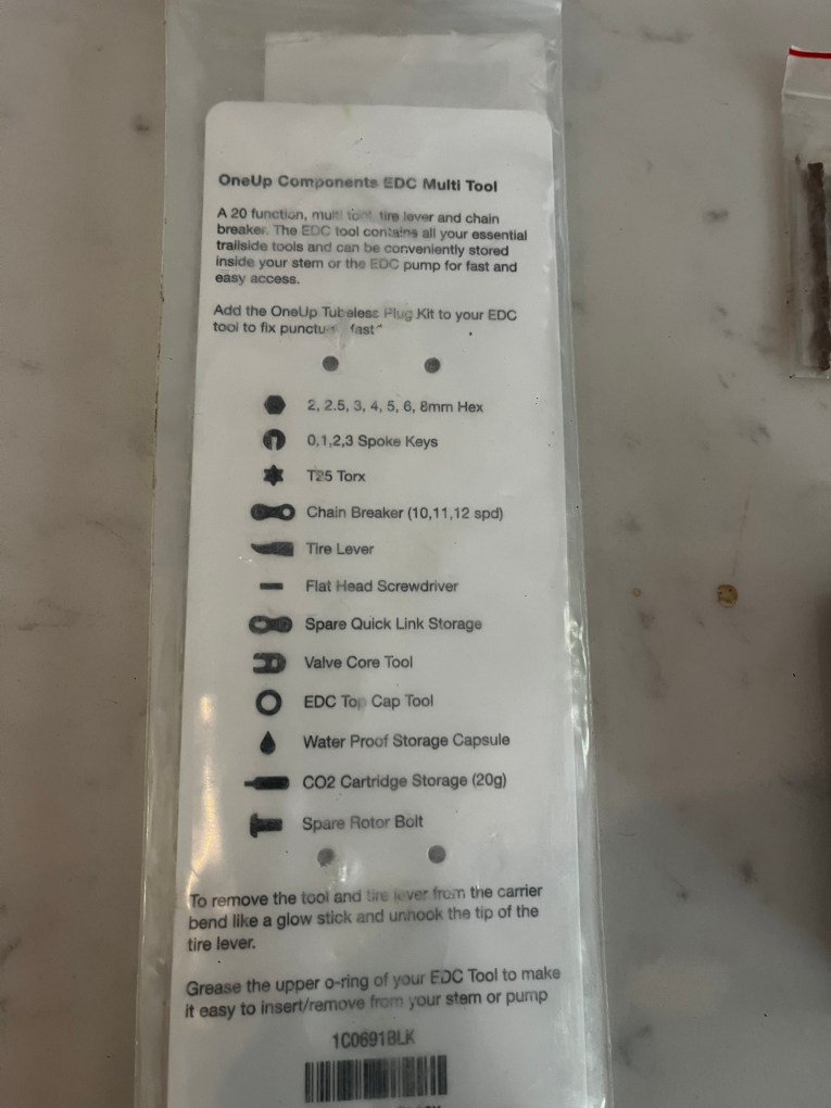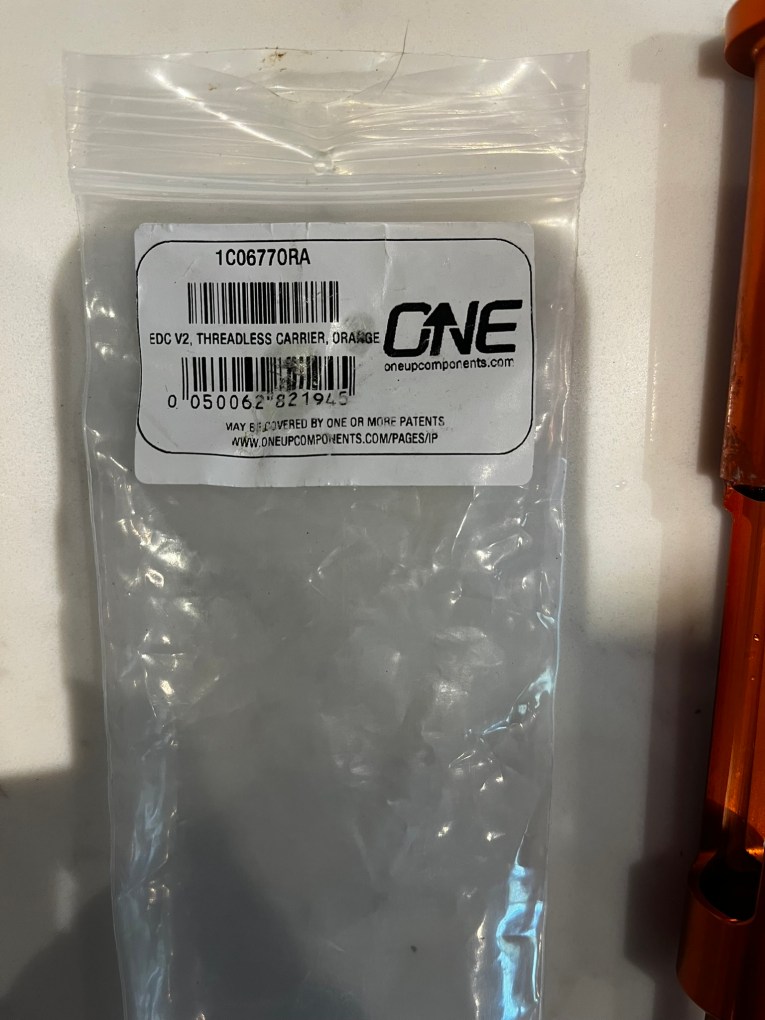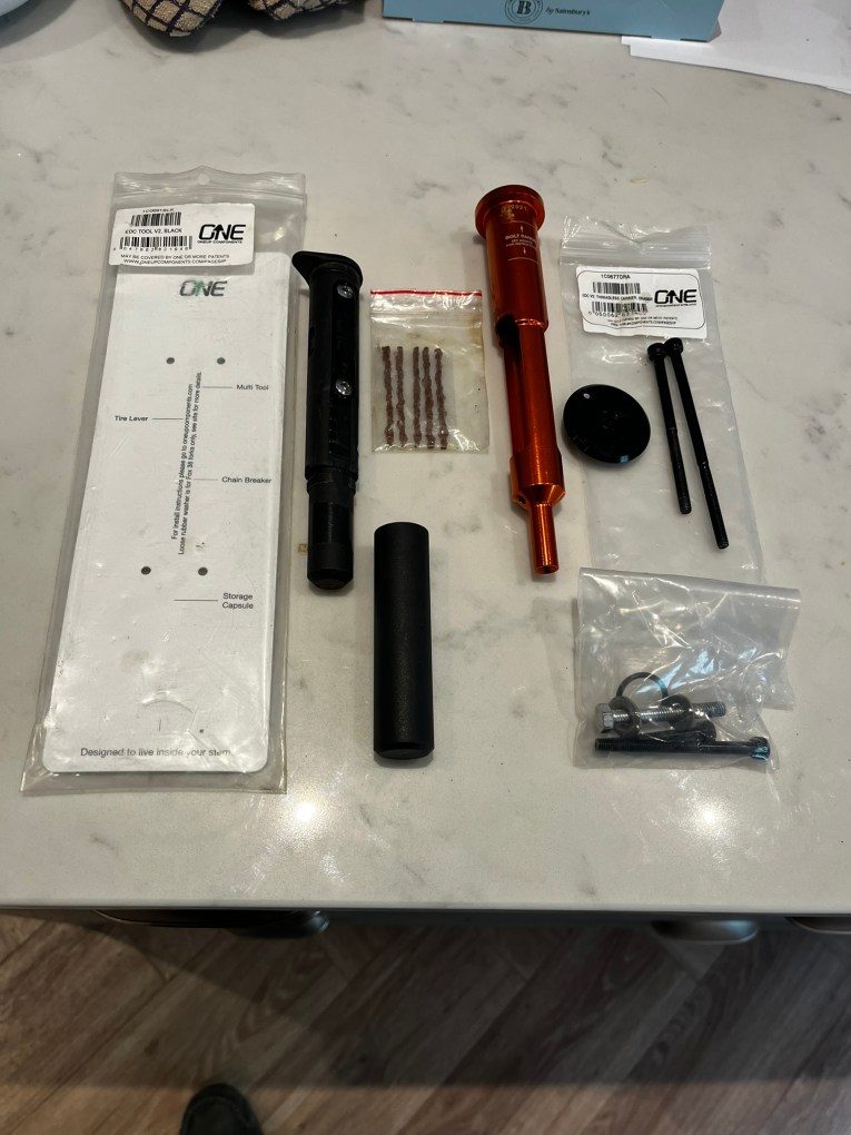 One Up EDC Threadless carrier kit, comprising the carrier, tool and tyre plug addition. Link below