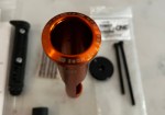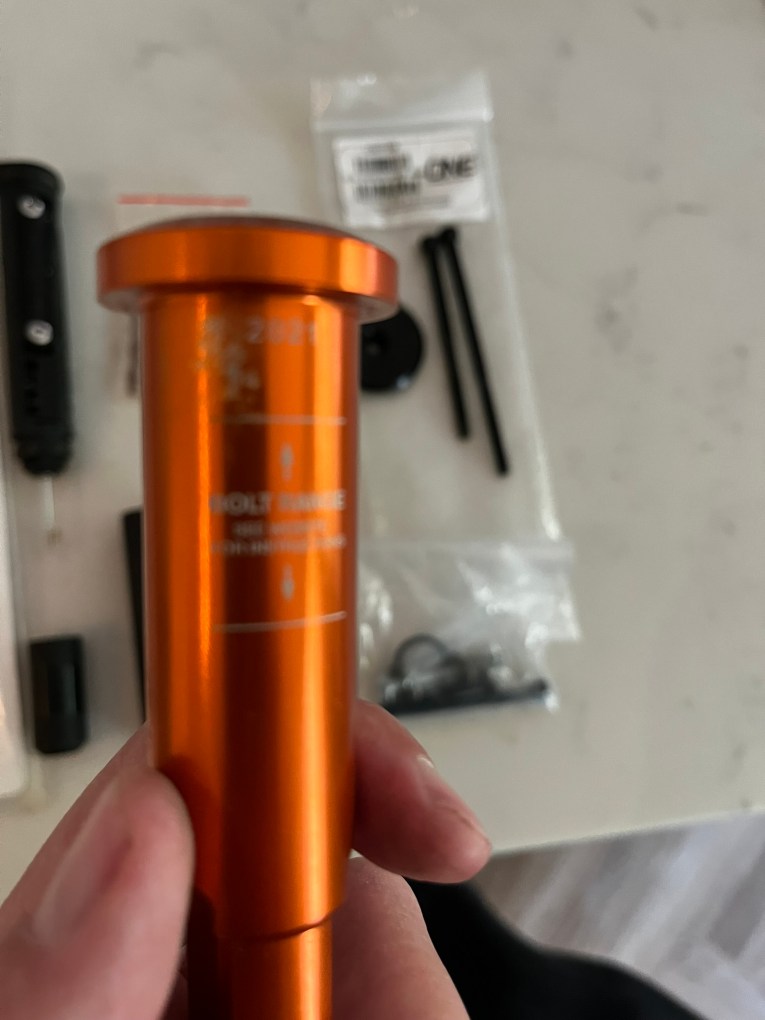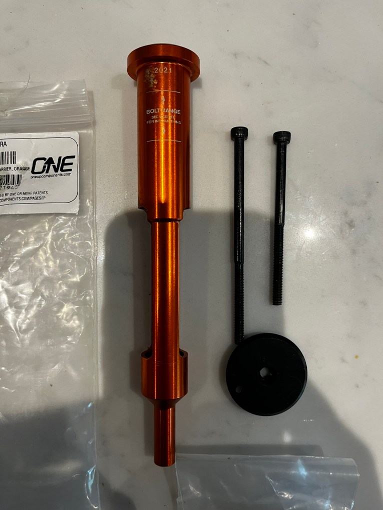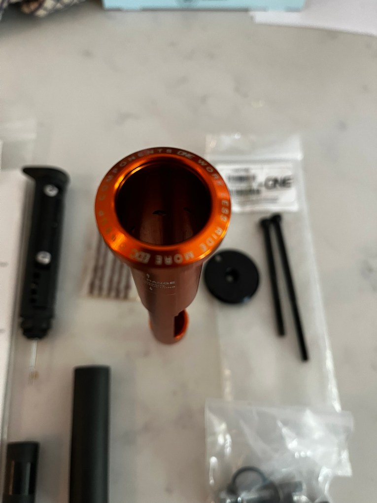 Orange in colour. Few marks associated with use on the carrier from being inside the fork tube, but top section is near perfect.