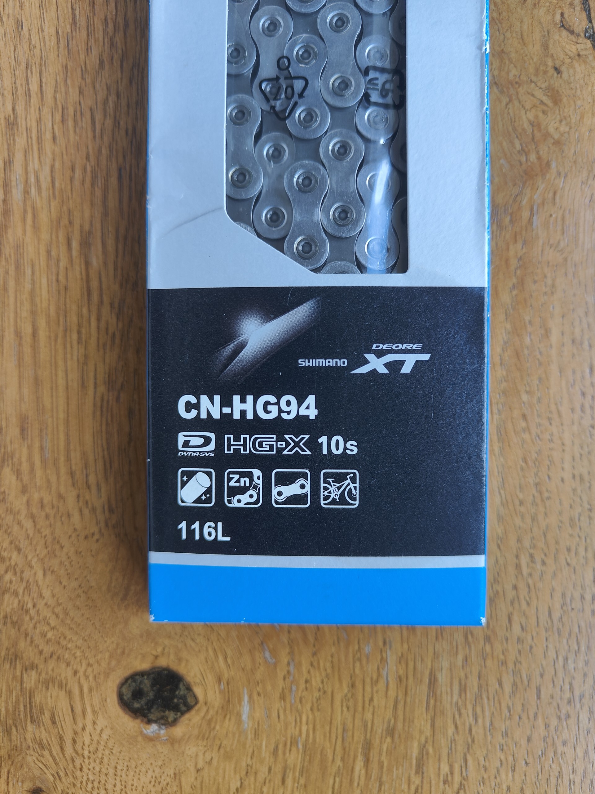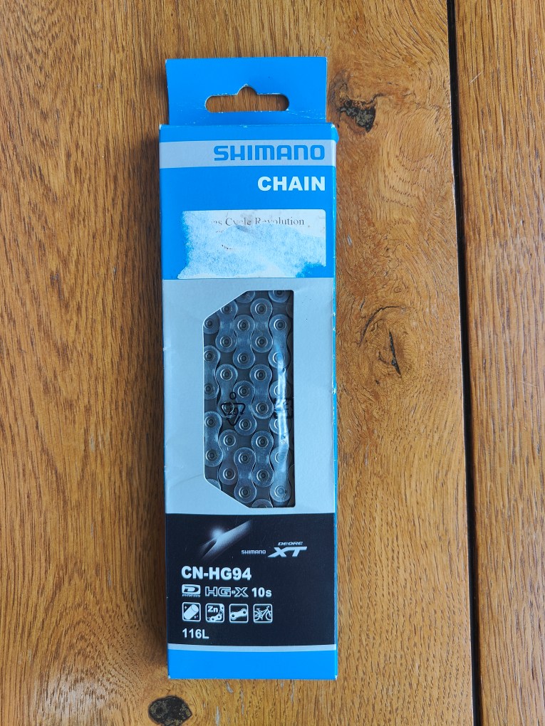 Brand new 116 link Shimano XT CN-HG94 10 speed bike chain. Boxed. Collection from Dorking in Surrey or can post for £3.