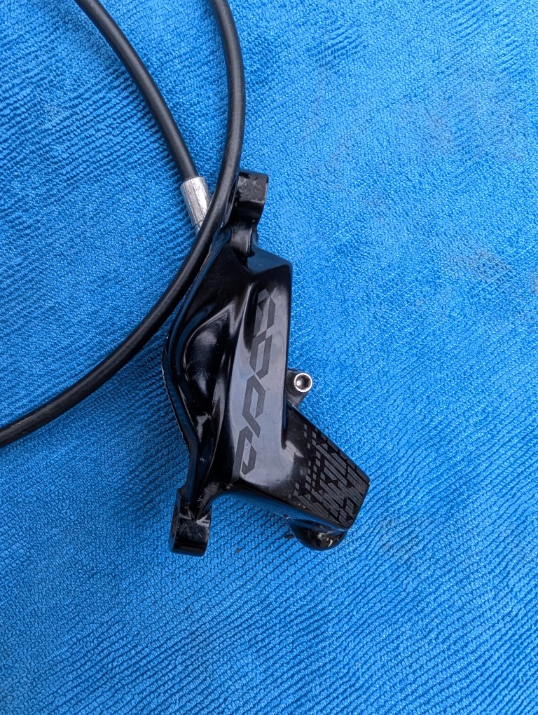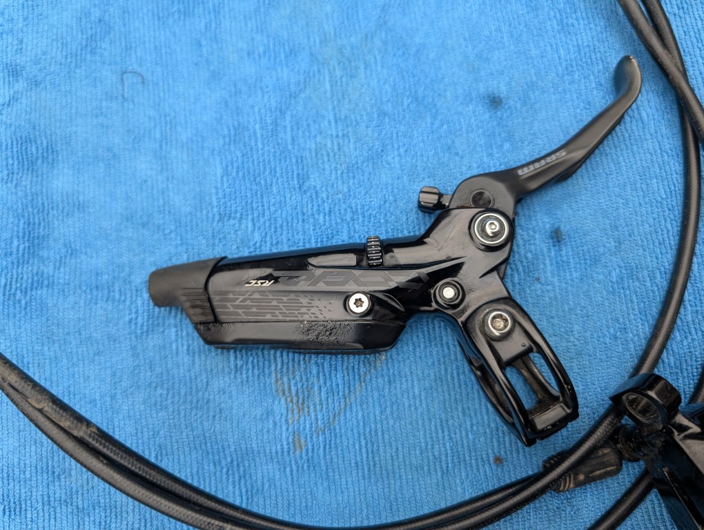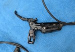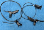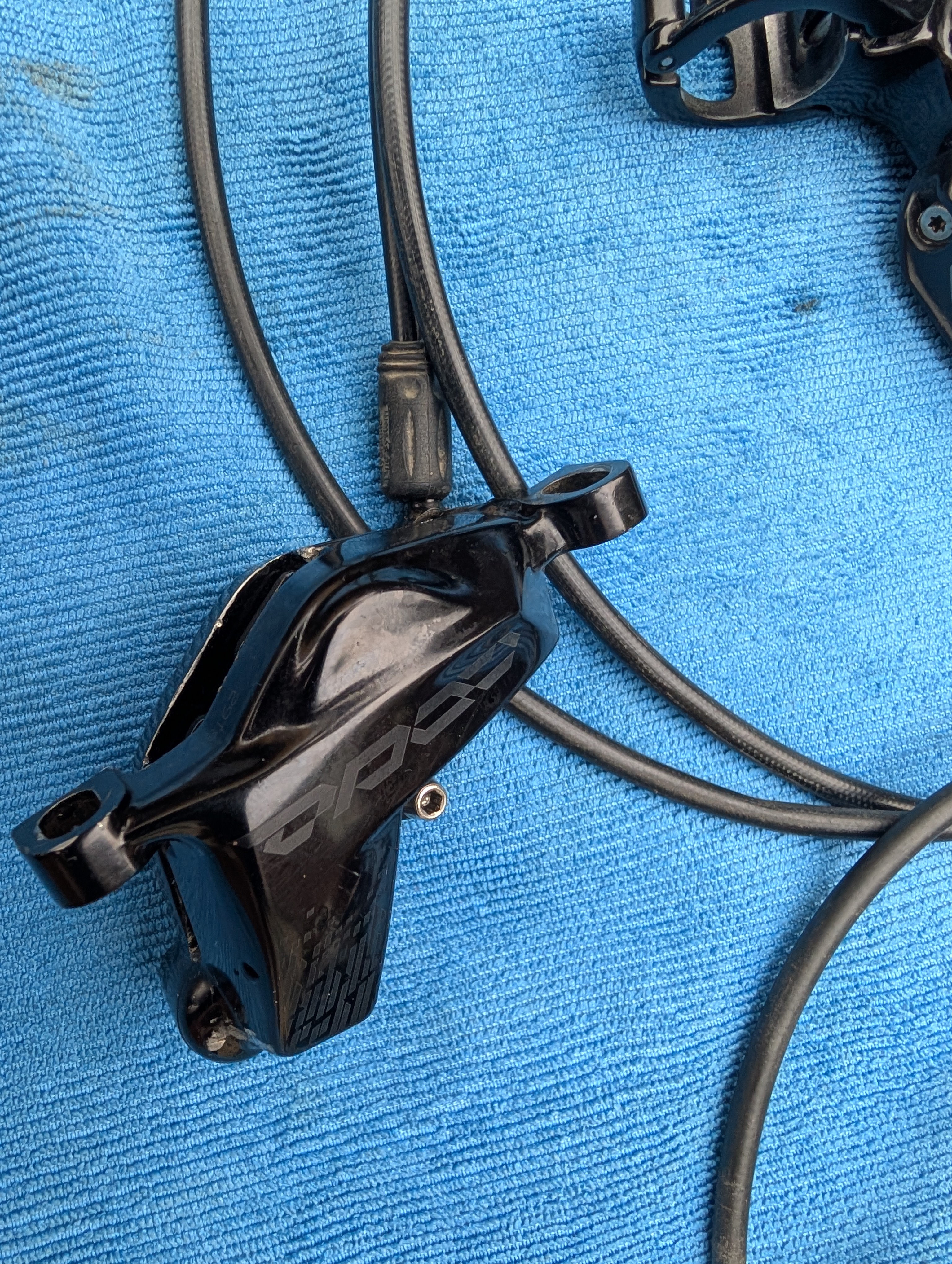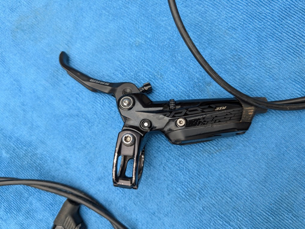 Sram Code RSC brake set. In good used condition with no faults. These brakes are 2 years old and work as they should.There is a bit of fluid damage to one lever shown in the pictures, this was caused by a leaking master cylinder cap which was replaced and has been faultless since. They were internally routed so rear hose been cut for removal but will come with a new olive & barb.