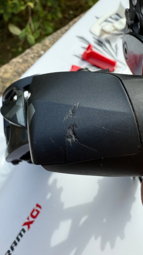 The derailleur has had a knock (see photos) and does shift but cannot engage all 12 gears accurately – you can have 1-10 or 3-12 working well and the other two noisy/jumping but not all 12. Have tried a new cage and new cassette (not included) but neither helped so have had to conclude it’s the derailleur itself. Done about 300 miles in total before this damage caused by an ‘off’ at a bike park.
