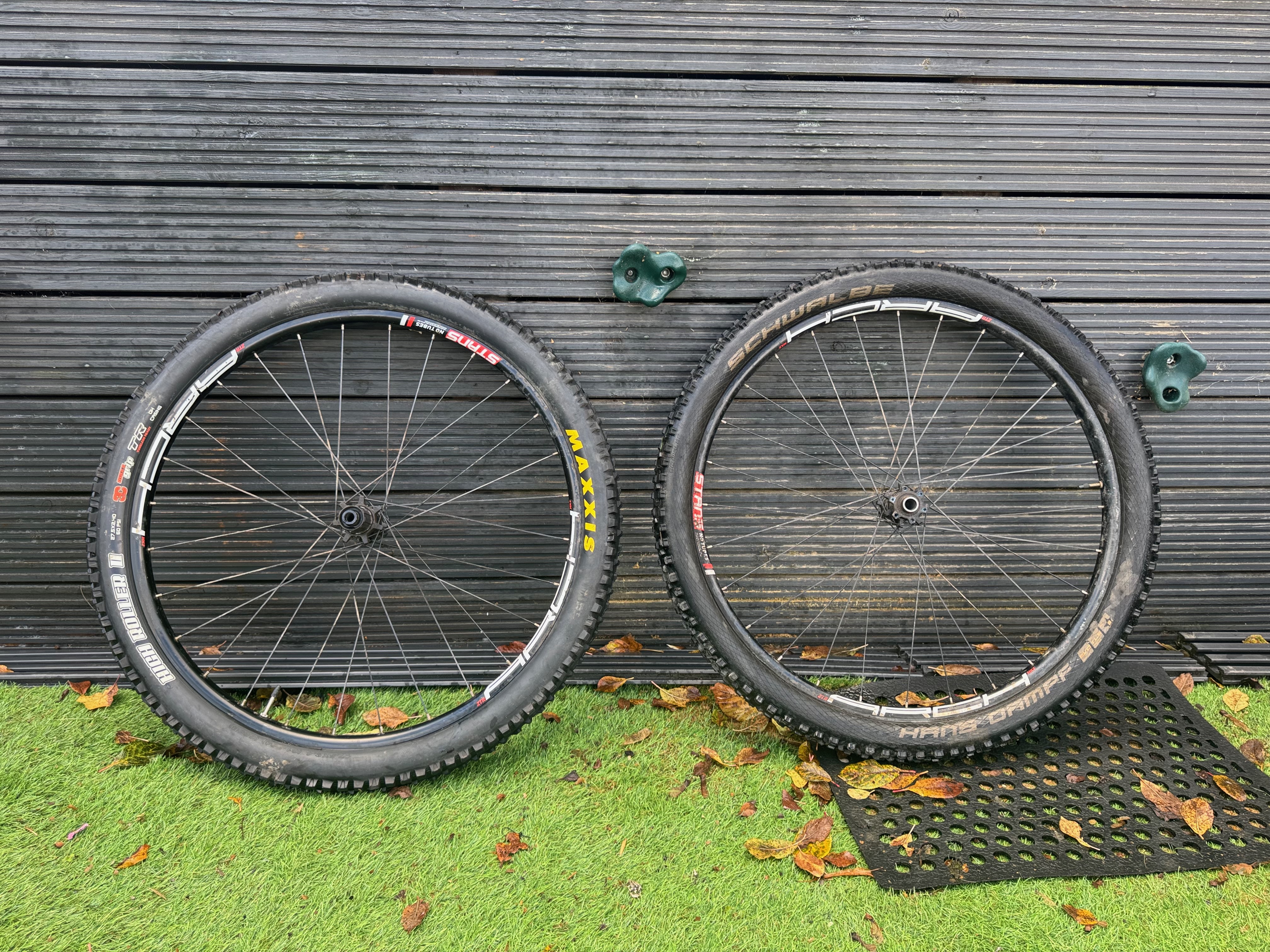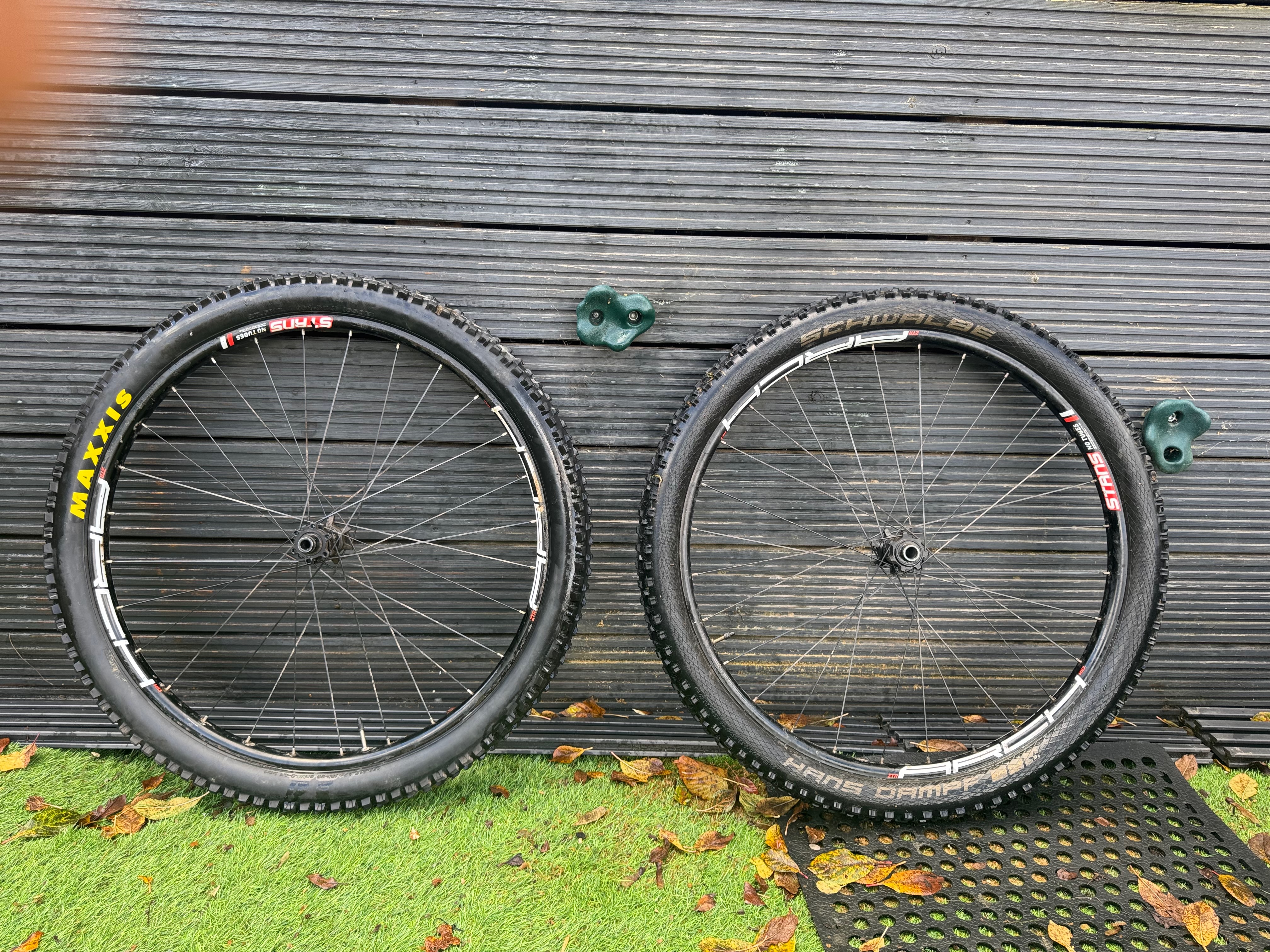 Very lightweight, hand built wheelset with Stans ZTR Arch rims (nicer than the S1 rims that you usually see on Arch wheelsets) built up on non-boost Bontrager Rhythm Comp hubs with bladed spokes for strength and weight saving. I think that they Sapim CX Ray. HG freehub. Tires included: Schwalbe Hans Dampf on the front, Maxxis High Roller II on back. Used by both of my kids to make their first real bike lighter and more responsive.