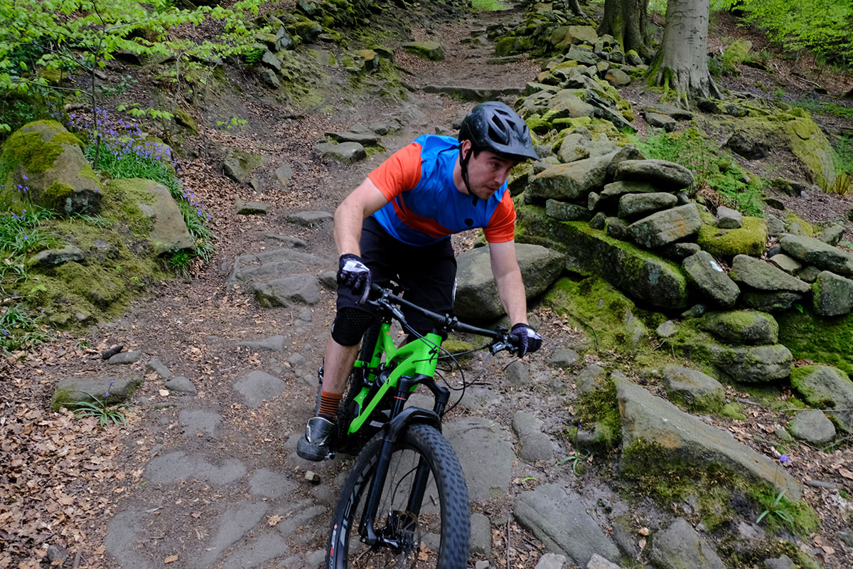 Another climb, another trail, and then a short moorland push where the rough and the steep contrive to defeat even the turbo setting on our Levos. At this point we notice the lack of a ‘walk assist’ function, but the push is short and the view at the very top of the world is worth it. We attempt a Facebook Live broadcast, but the wind changes, or a curlew sits on the antennae, as we drop from 4G to nothing. Perhaps it’s just as well, as Georgia has the giggles. We embark upon a series of aborted attempts at recording a video.