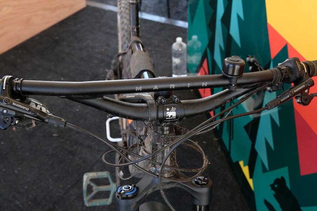The Marin steel e-bike was set up as a sort of backwoods adventure bike, with luggage (that held a spare battery and a charger…) and some Marin-logo klunker-style handlebars that not only look the part, but which allow a ton of space for your GPS, lights, bell and other accessories.