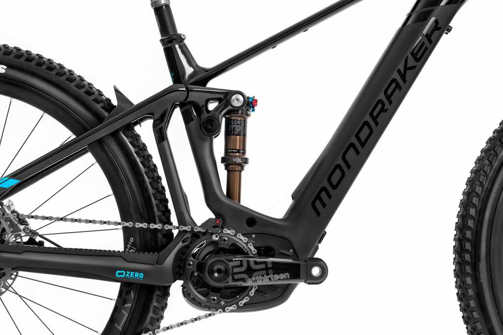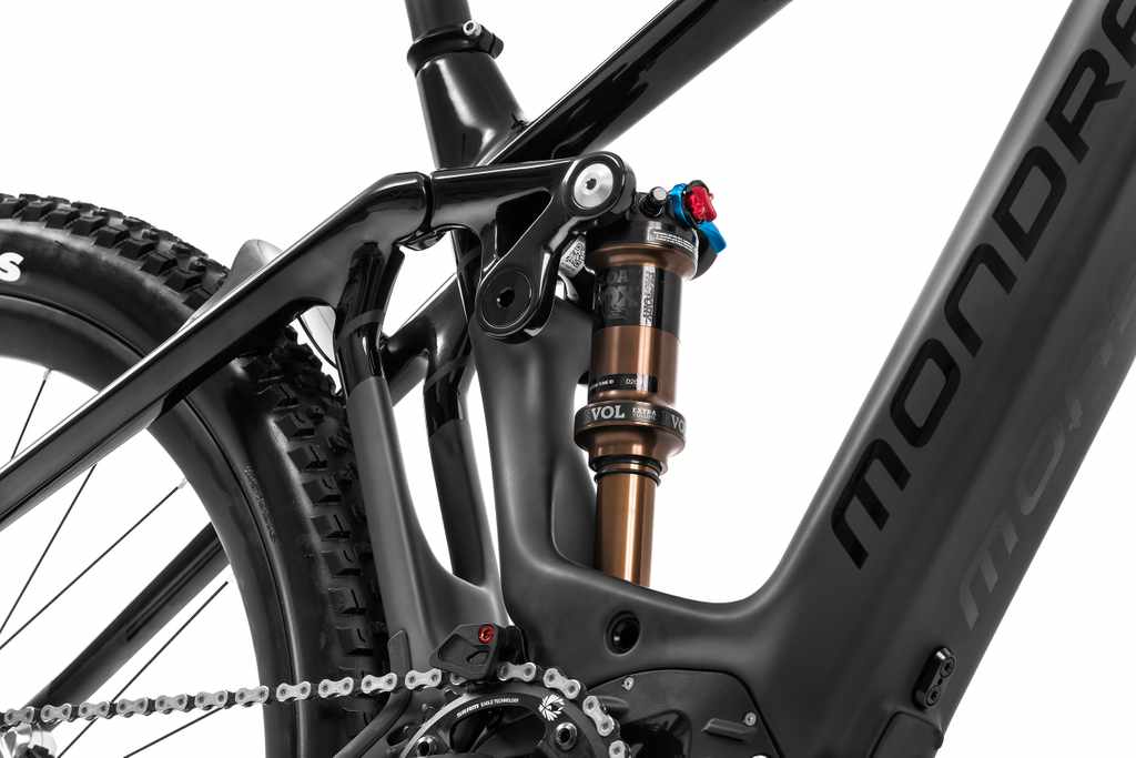 Scoot to the rear of the Crafty Carbon and you’ll see Mondraker’s new suspension platform that was already seen on the alloy Crafty. The new e-MTB specific suspension system offers 150mm of rear-wheel travel and uses a longer lower link and new shock location. The idea behind the new system is to offer better all-around traction, improved pedal efficiency, better small bump compliance, stable platform while retaining some progression.