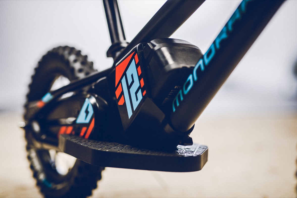 The promotional imagery shows kids riding some jumps and pump tracks. On a balance bike, without pedals, you can’t put a quick half crank in to add a bit of speed, but with a bit of motor assist that’s an option. With space to put your feet while you’re motoring, kids can keep their feet up and out the way, or stand up to clear features. These design features would seem to lend themselves to more technical riding opportunities. But with the foot platform, it would be interesting to see how easy it is to use your legs to ‘paddle’ like a standard balance bike.