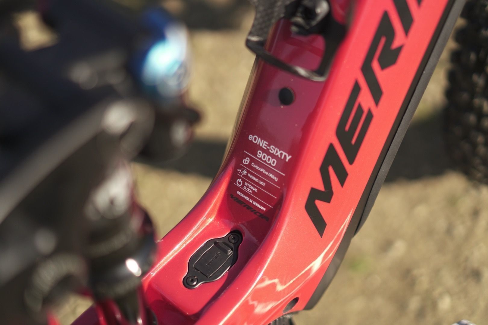 Just like the 2020 model Merida uses an “internal block” in the headtube to prevent the fork hitting the frame in a crash. Rubber bumpers are also located on the frame for further protection, and the rear end and battery cover gets rubber armour too.