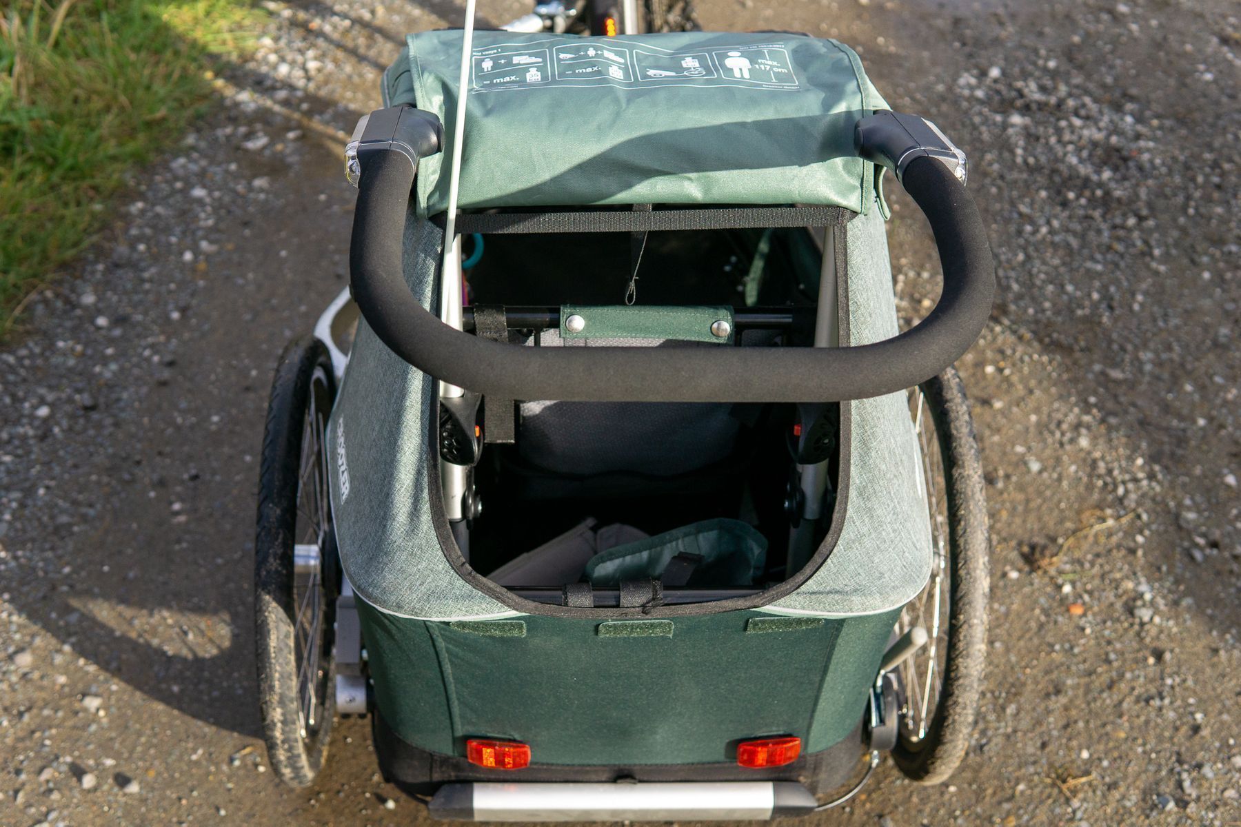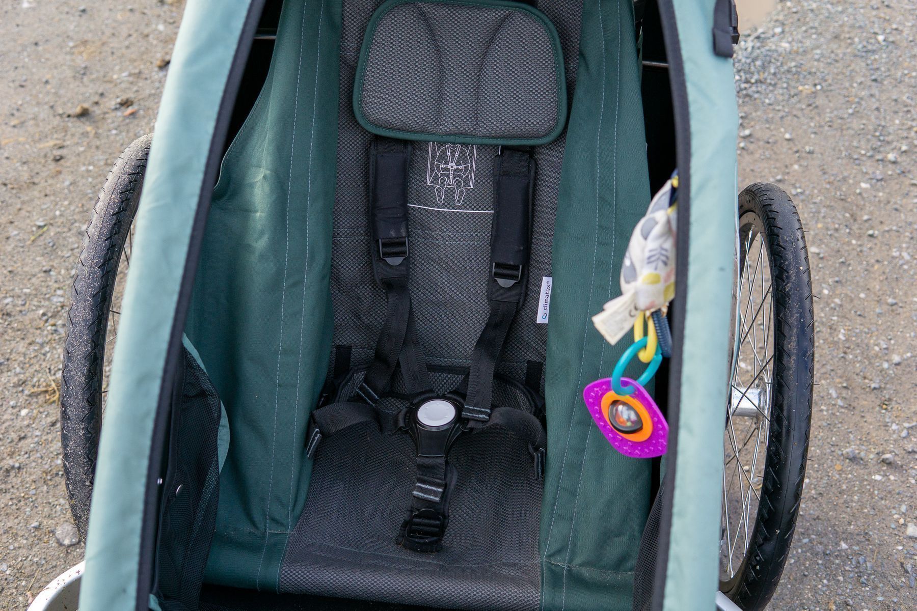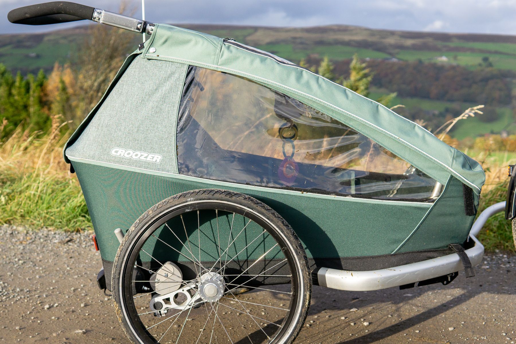 Lashing your offspring down is easy thanks to a five point harness with separate clips, which makes me wonder why all child seats don’t have this. There are a couple of handy mesh pockets for toys and snacks. The front half of the trailer is fully waterproof, with the option to roll up the cover on dry days. There’s also a boot which adds a decent amount of luggage capacity. Croozer claim it holds 43 litres, although the frame of the trailer reduces this somewhat in practice.
