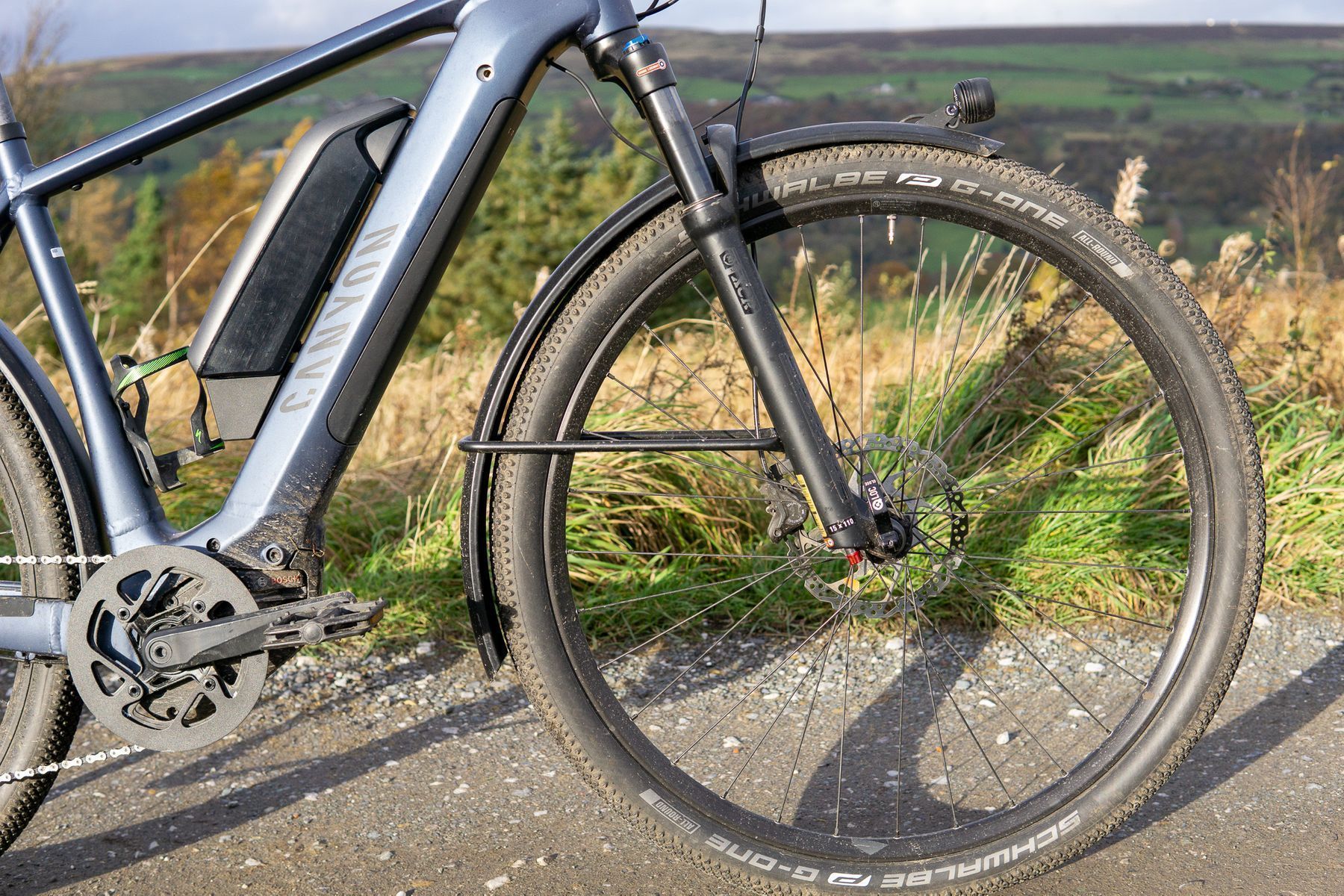 Unless you go for the smallest size, all of the Pathlite:On range roll on 29in wheels with tubeless-compatible Alex rims. Schwalbe’s fast-rolling G-One tyres are a fixture of the gravel scene, but here they’re scaled up to a 2.25in mountain bike size. They don’t arrive set up tubeless, and given the bike’s intended use I opted not to do this for the review.