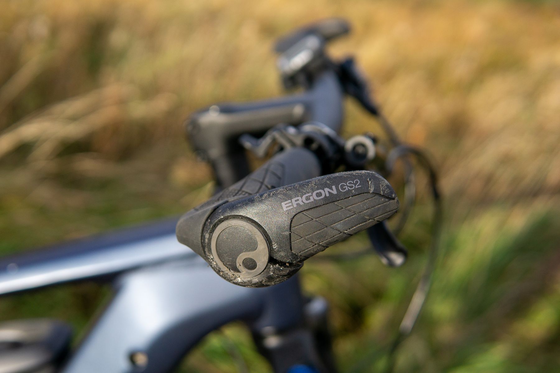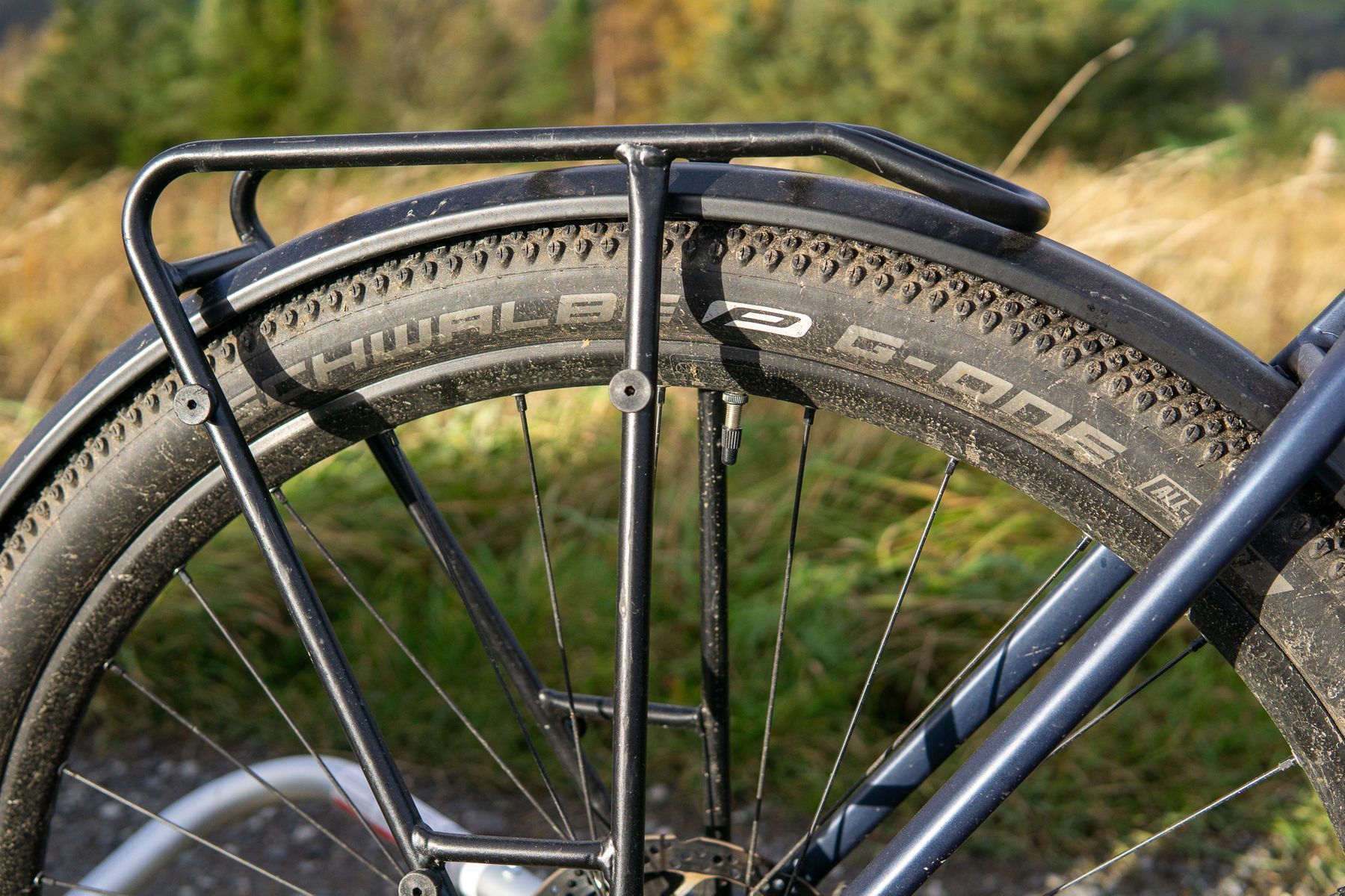 Off-road descents, unless they’re nice smooth ones, are better taken steady. The 1990s geometry and narrow bars don’t encourage you to push the bike much, and the forks are nice and stiff, but lack a bit of support. Speaking of stiffness, the back end of the frame is also quite unyielding, something that going tubeless or fitting a suspension seatpost might help to alleviate. The Schwalbe G-One tyres have a surprising amount of grip, although a tread with a more defined edge might be better suited to our muddy little island. Having had one puncture, I also wonder if a tougher casing might suit the long haul aspirations of the bike better.