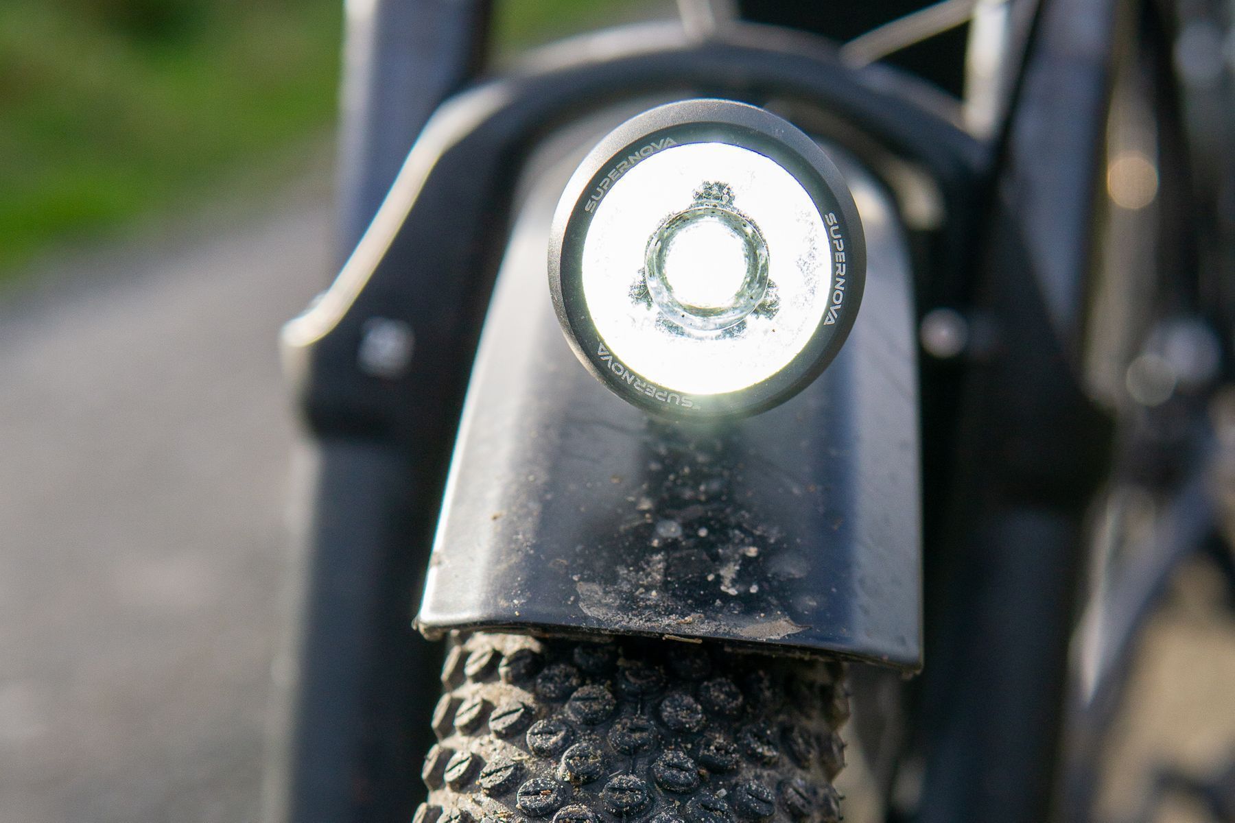 The dual beam Supernova headlight is another great bit of kit, with one setting for road and a wider full beam that’s easily bright enough for off-road. It’s let down slightly though by the repositionable magnetic dip switch. The bracket spins on the bars easily, making it hard to press the button, and on rougher trails the button tends to separate from the mount and ends up dangling on its wire like a fishing lure. There’s also no indicator as to whether you’re on high or low beam – ok at night but during the daytime you might end up dazzling oncoming traffic.