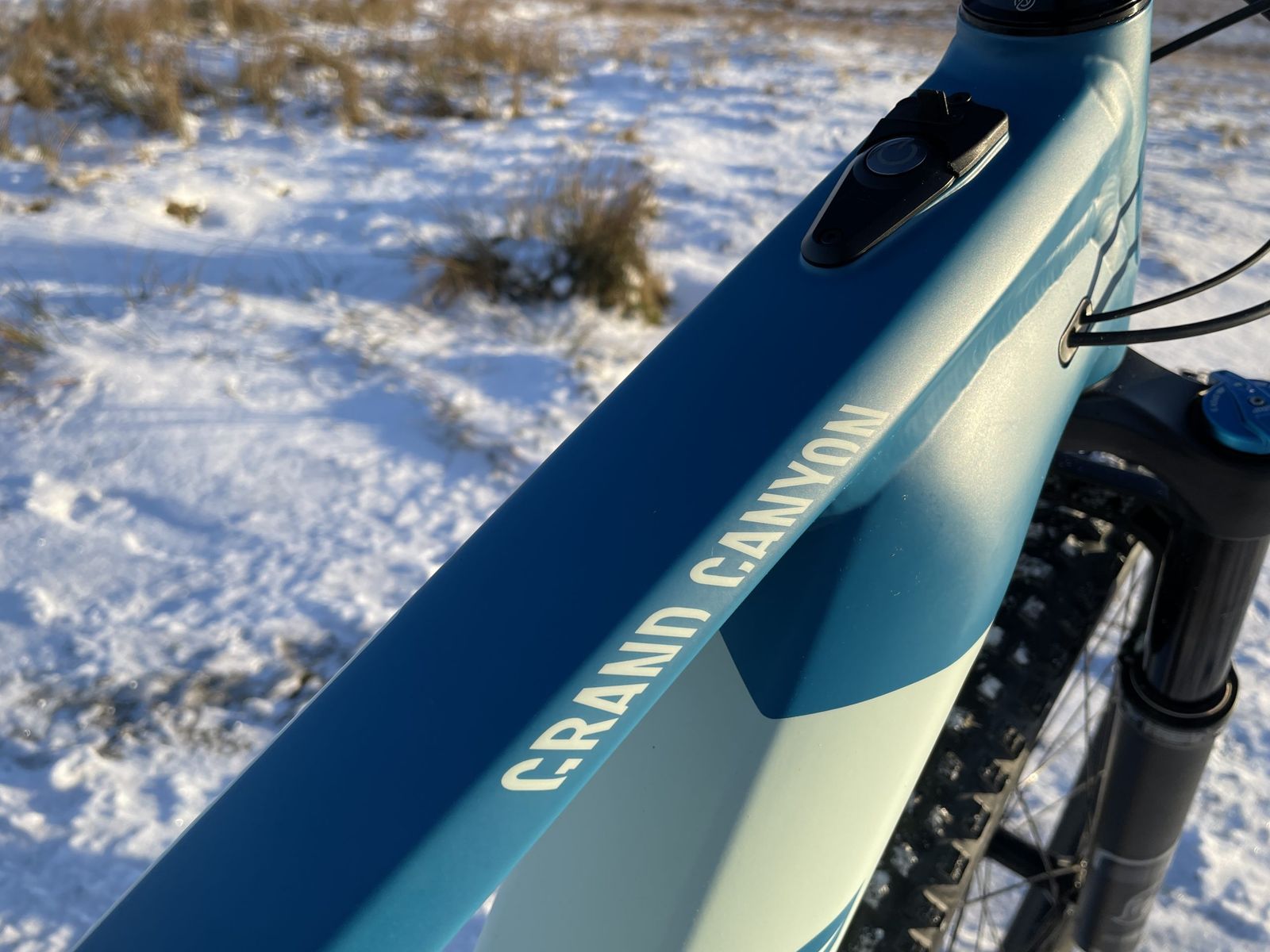 Just arrived at Singletrack Towers and taken straight out to play in the snow, it’s the Grand Canyon:ON 9 from Canyon, in a size Medium. Let’s take a closer look.