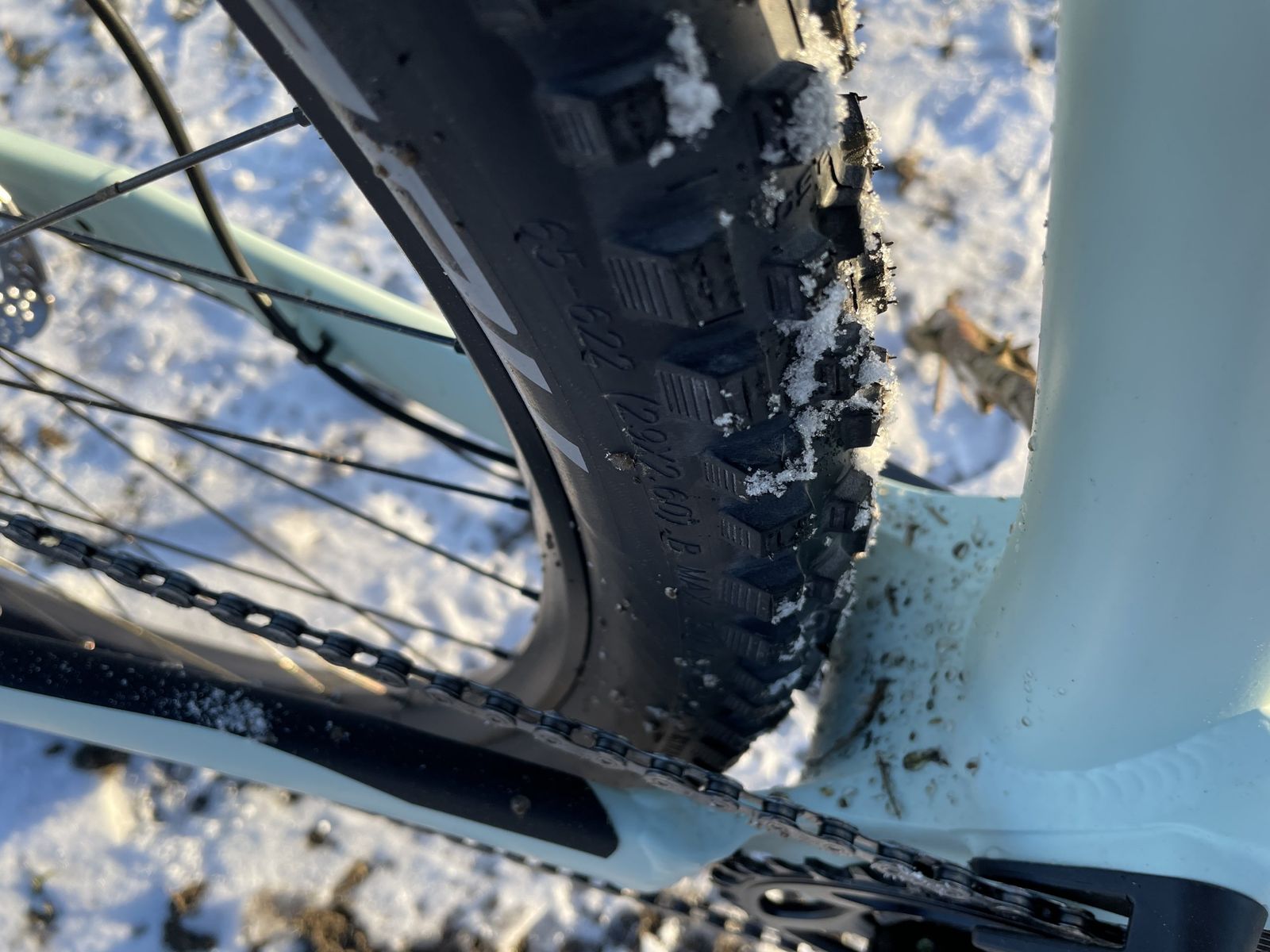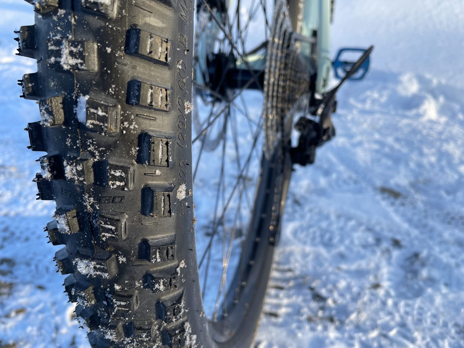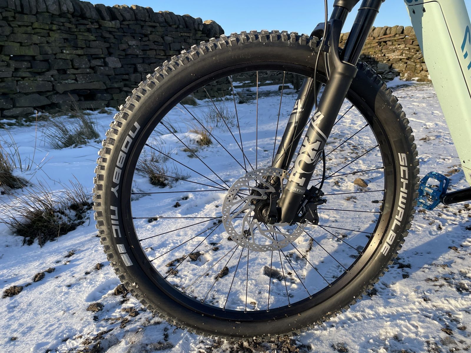 Schwalbe Nobby Nics are front and rear – and as we’ve got a Medium bike, they’re 29er wheels.