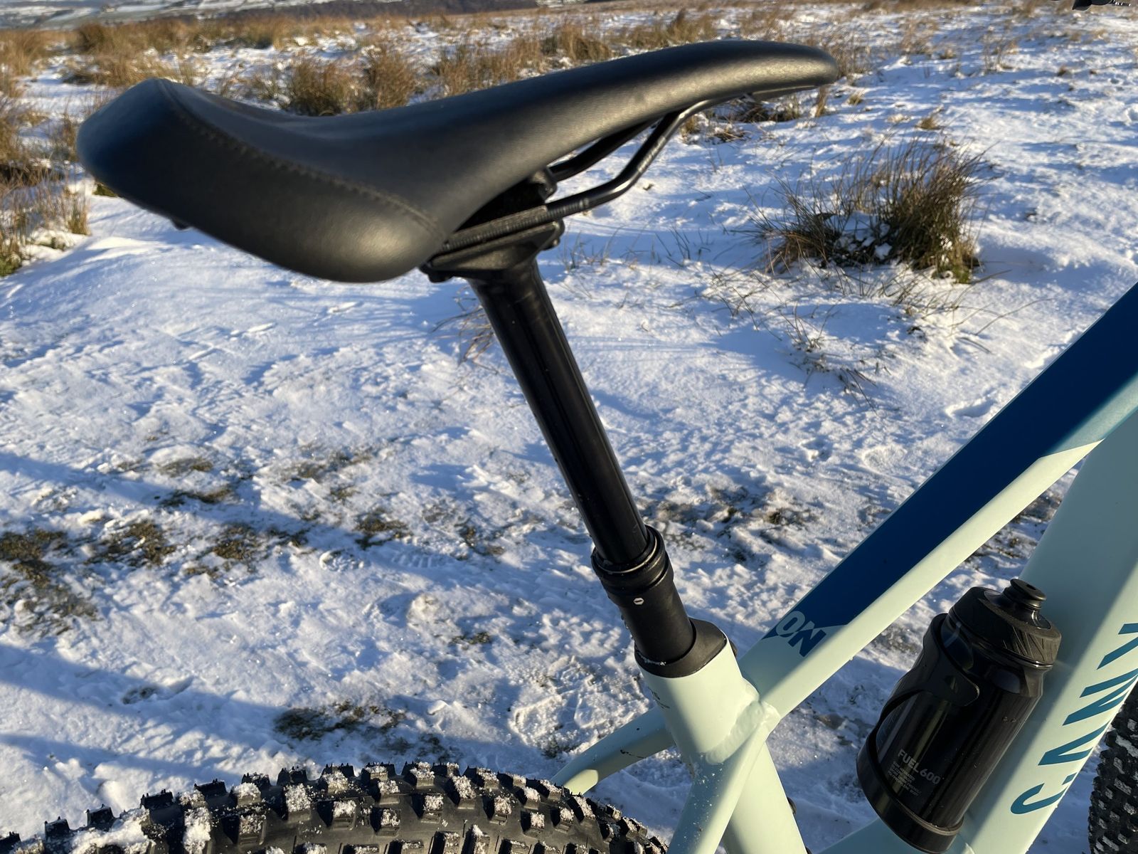 You get an own brand dropper post, eBike specific saddle (this has a raised rear to it, to help with seated climbing, plus plenty of padding for comfort on your sit bones), and the seat post clamp is integrated into the frame.