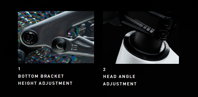 The head angle ranges from 63 – 65.5 degrees and the BB can be dropped by 7mm