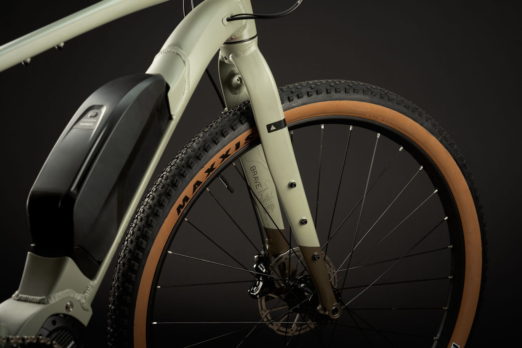 “The semi-integrated 630wh external fitted battery packs massive range and offers easy removal, while leaving room inside the main triangle for frame bags. Bottle cage mounts and fixing points for gear are thoughtful placed throughout the frame and fork (5 bottle mounts and 14 bosses in total), offering the rider ample options for outfitting the BRAVe with whatever is needed on the ride ahead. Boost hub spacing makes the huge tyre clearance possible and the lowered fork bridge maintains full fender compatibility for year-round service.“