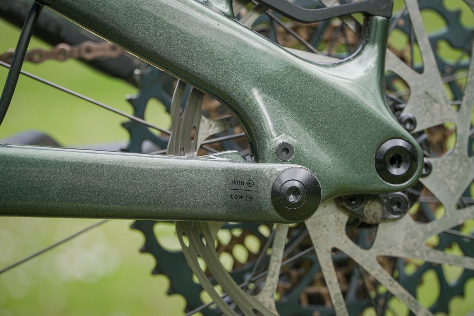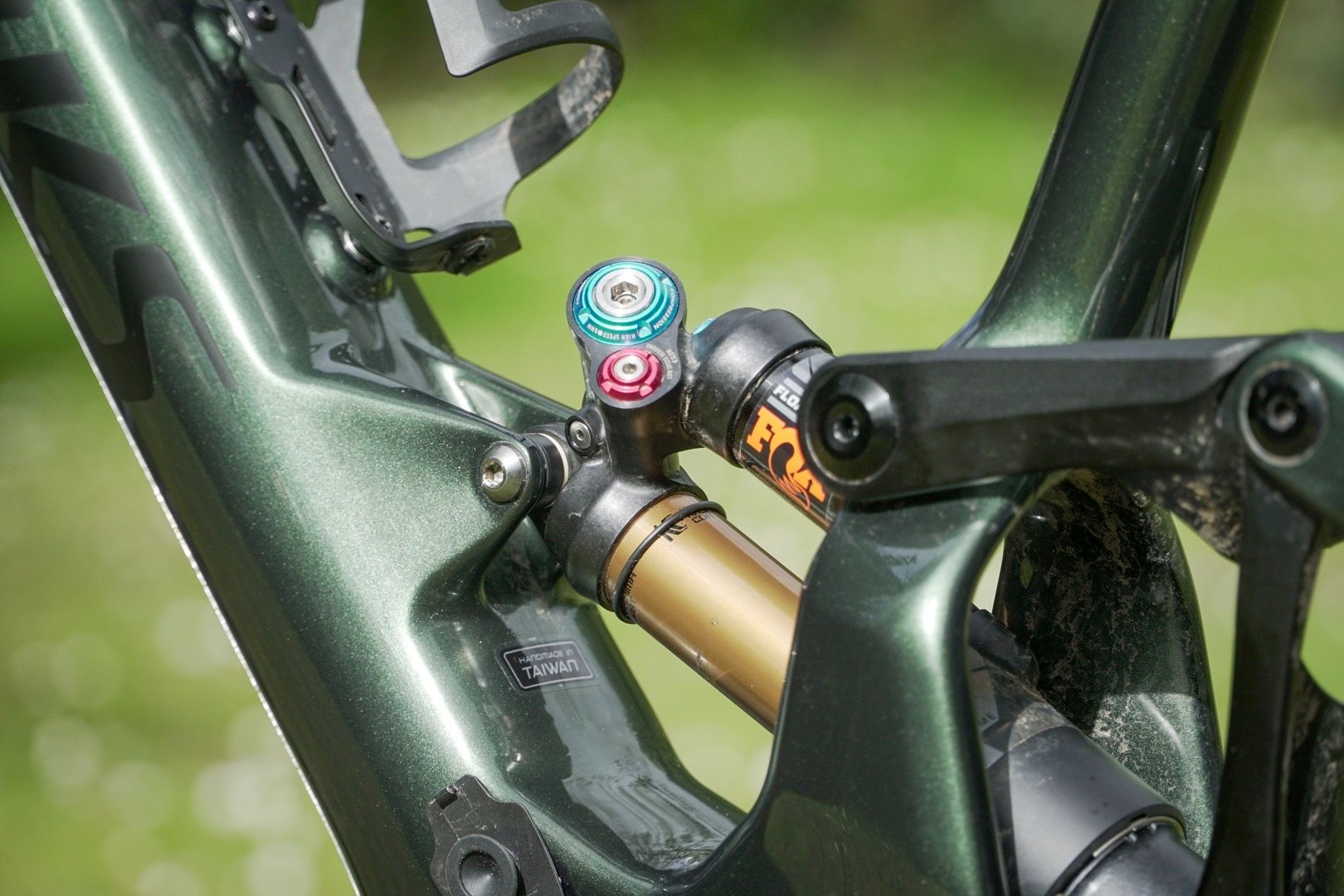Another important change to the Kenevo SL frameset over the Enduro is the additional geometry tuning options. The Enduro offers both angle and BB adjustments via rotating chips in the shock eyelet, but the Kenevo SL provides these tweaks using different methods. For head angle adjustments, the SL is supplied with optional headset cups offering front end angles from 63.5 to 64.5 degrees. The bottom bracket height is independently adjusted via an eccentric Horst Link bolt, offering 6mm of movement.
