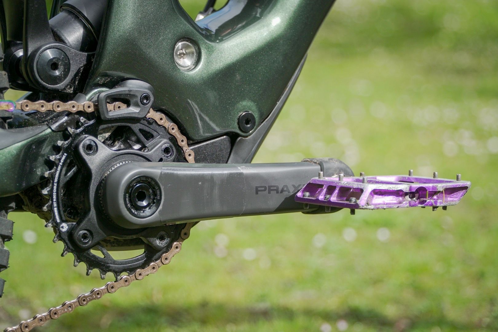 Ah yes, this is a Kenevo SL S Works build costing a cool £12,500. For that huge wedge of cash, you get an AXS wireless dropper post, AXS wireless shifting, 12-speed Eagle XX1 in a lovely bronze finish, and lots of carbon. Wheels are carbon Roval Traverse, as are the 800mm wide bars. Finishing off the carbon is a pair of 170mm Praxis crank arms. There’s no point having 170mm of wheel movement without decent damping and adjustability, so I was happy to see a Fox Factory 38 on the front and matching Kashima X2 rear shock. While lighter than most ebikes, the Kenevo SL still has plenty of mass to it so SRAM Code RSC brakes are employed for stopping and Specialized’s own Butcher T9 (front) and T7 (rear) tyres offer up the traction.