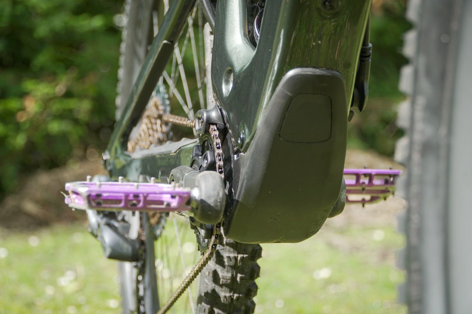 Despite the low shock position and the numerous pivot points and linkages, Specialized’s engineers have still found plenty of room for an extremely neat SL 1.1 motor integration, and the chunky carbon downtube provides ample room for the Kenevo SL’s 320Wh battery pack.