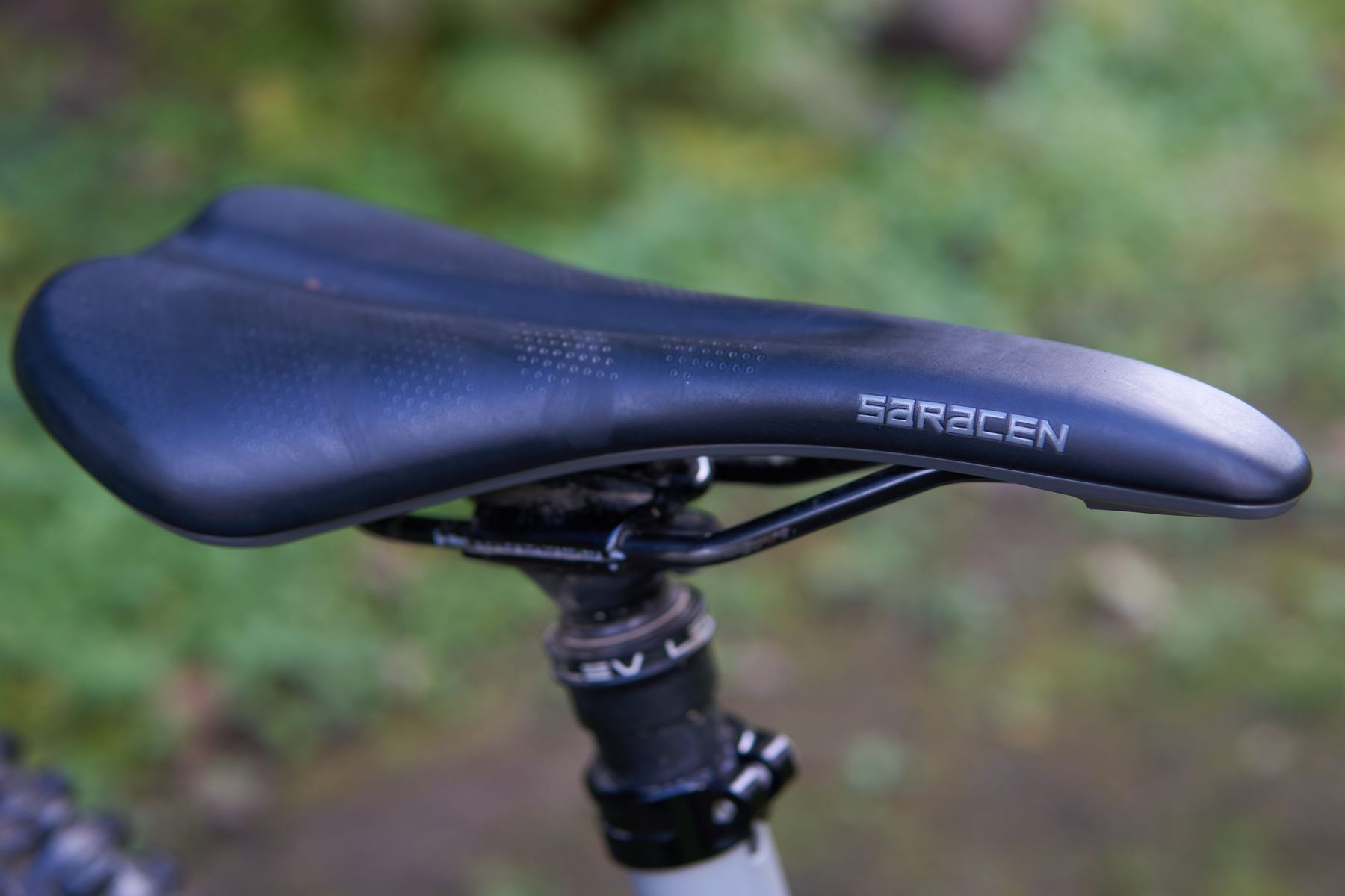 The finishing kit is appropriately nice, without being outrageous: a Saracen branded saddle on a KS Lev 150mm dropper post with an under-bar lever, and ODI Elite Motion lock-on grips (basically the same pattern as the venerable Ruffian BMX grip) on a 35mm diameter Race Face Turbine R handlebar.