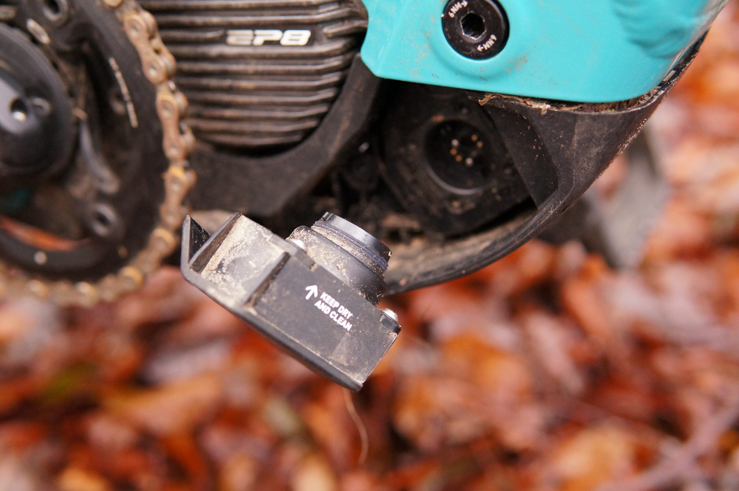 The power assist is from a Shimano EP8 motor, powered by a custom 720Wh battery inside the downtube. This is really designed to be charged in situ although, if you absolutely need to, you can get it out by undoing a bolt and moving the motor out of the way. The charging port sits in front of the motor. It has a magnetic cover bearing the legend “KEEP DRY AND CLEAN”. Slightly optimistic given its location but easy enough to keep an eye on. There’s a simple two-button controller near the grip for the motor and Shimano’s unobtrusive EM800 display beside the stem.
