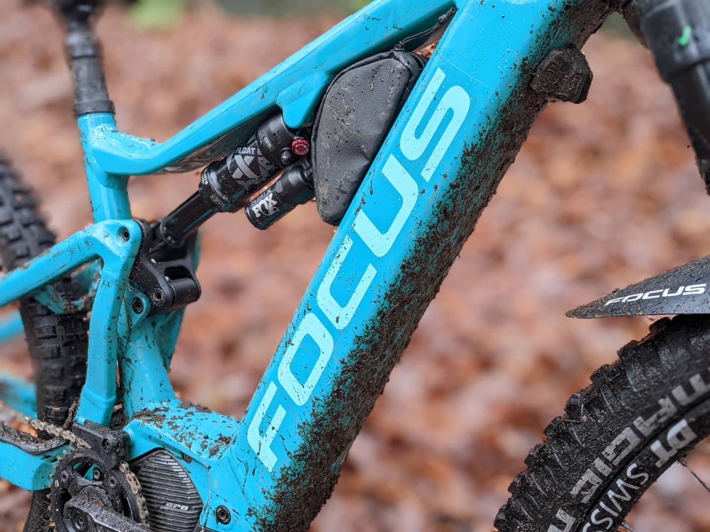 Even with the top tube mounted shock, the Focus Jam² also has a low centre of gravity thanks to the positioning of the battery and motor, The generous standover of the frame is most welcome in general too. The chunky wheels and soft compound tyres help give everything a nice planted feel. I’ve used a Schwalbe Magic Mary as a front tyre on-and-off for years but it’s still up there with the very best of them, especially in this version. The bike gives you plenty of confidence to hit slippery off-camber bits of trail with gusto.