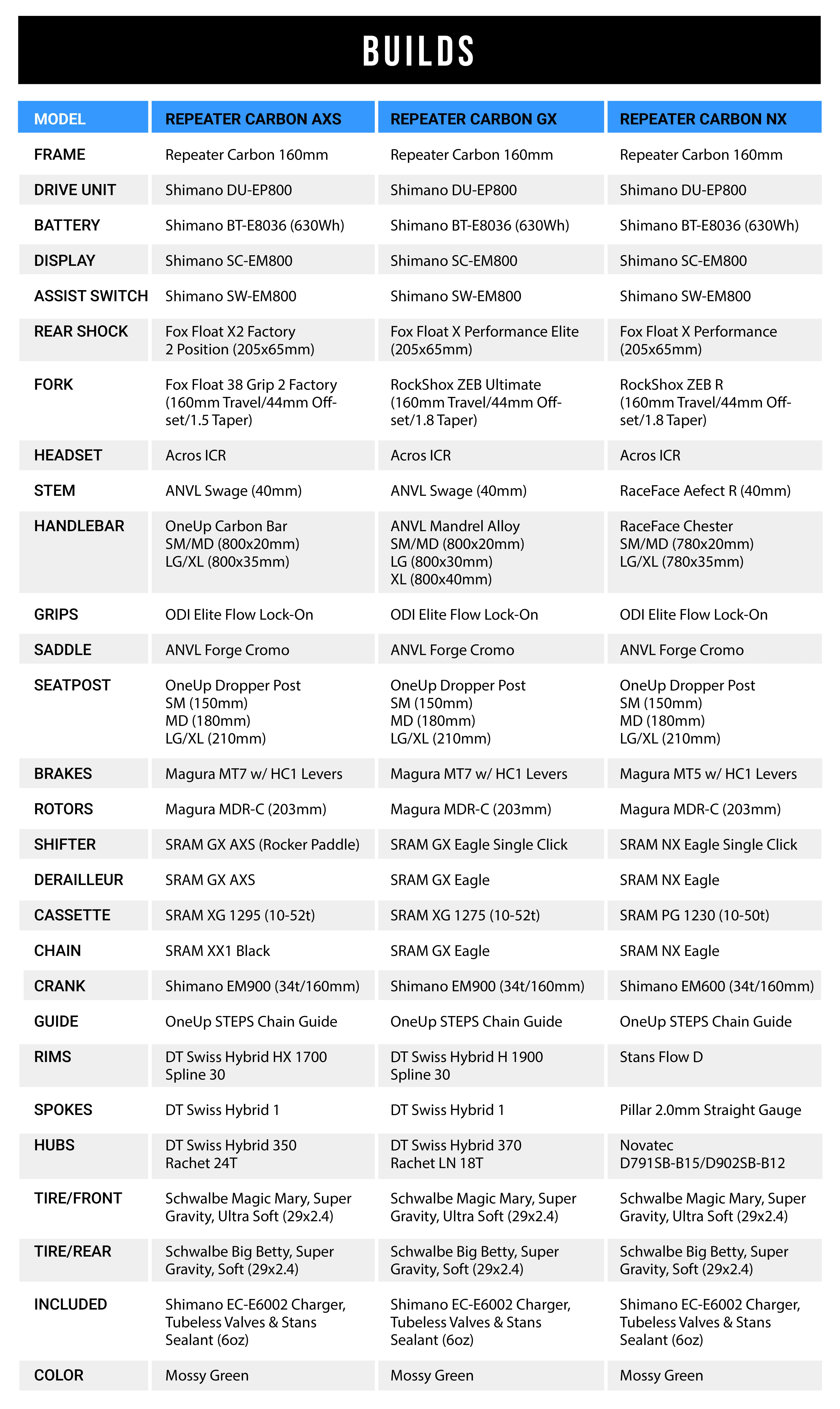 Transition Bikes: “Buckle up and get ready to charge, the Repeater is down for anything. With 160mm travel, 29 inch wheels, the Shimano EP8 motor system, and a 630w battery, you can maximize fun on the ups and the downs. Whether it’s a quick rip after work, ditching the shuttle truck, or just the pure joy of exploring that you are after, the Repeater loves it all. Like all of our other beloved bikes, the Repeater has SBG geometry and our GiddyUp suspension, so you’ll feel right at home the moment you turn on the power.”