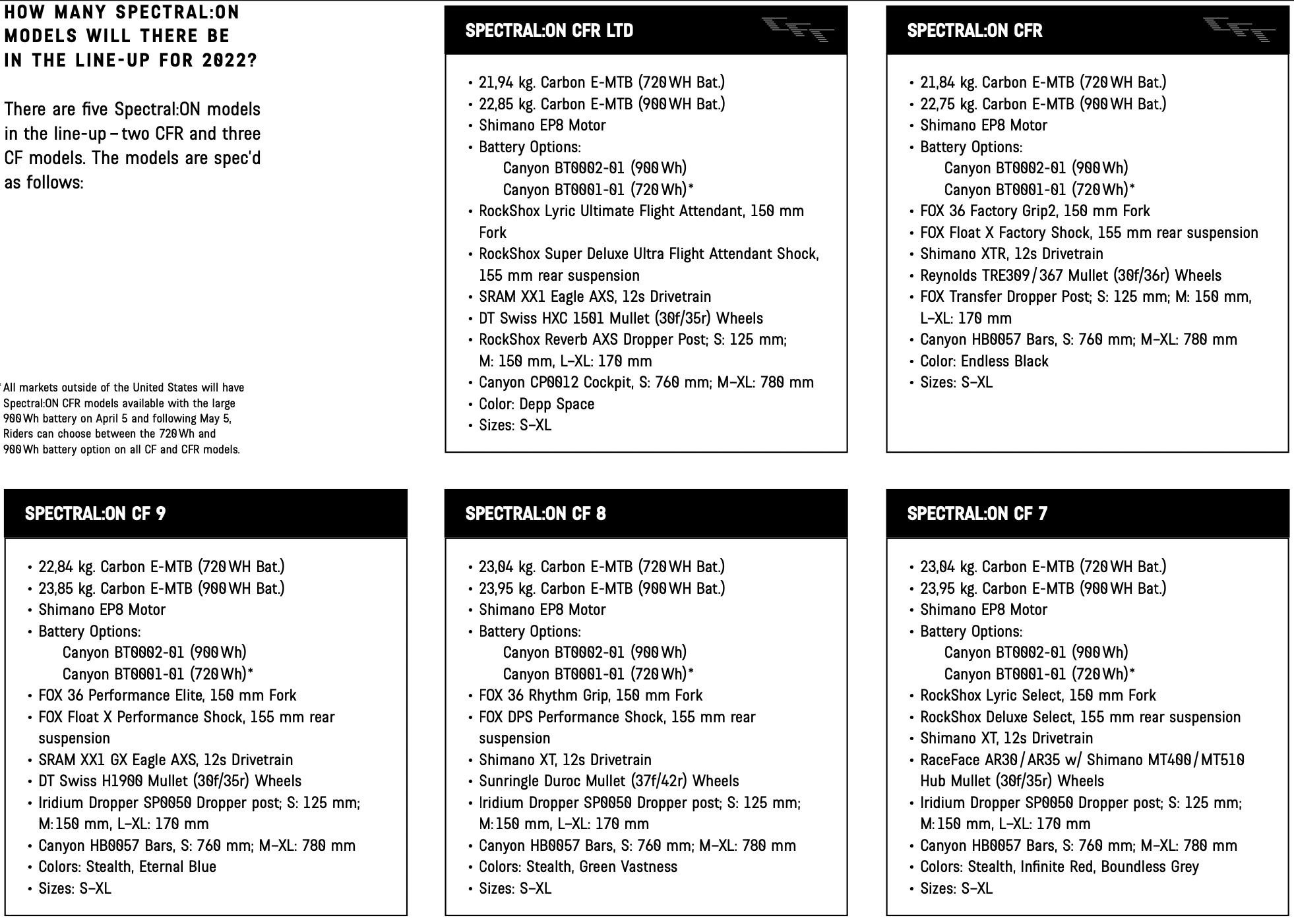 For instance, our flagship 2021 model, the XTR-equipped Spec- tral:ON CF 9, tipped the scales at 22.5 kg (size M). By contrast, our new XTR-equipped Spectral:ON CFR is 610 grams lighter than its prede- cessor despite being equipped with our larger 720Wh battery.