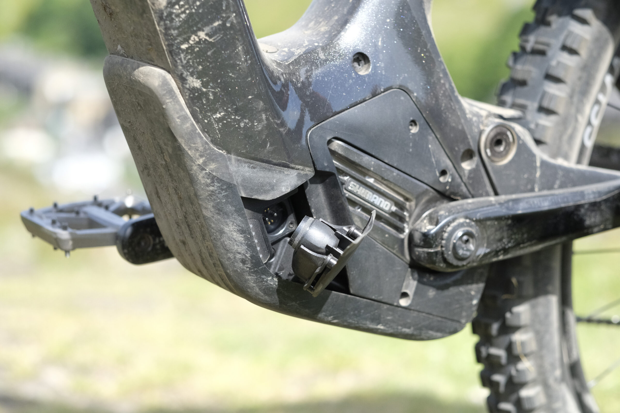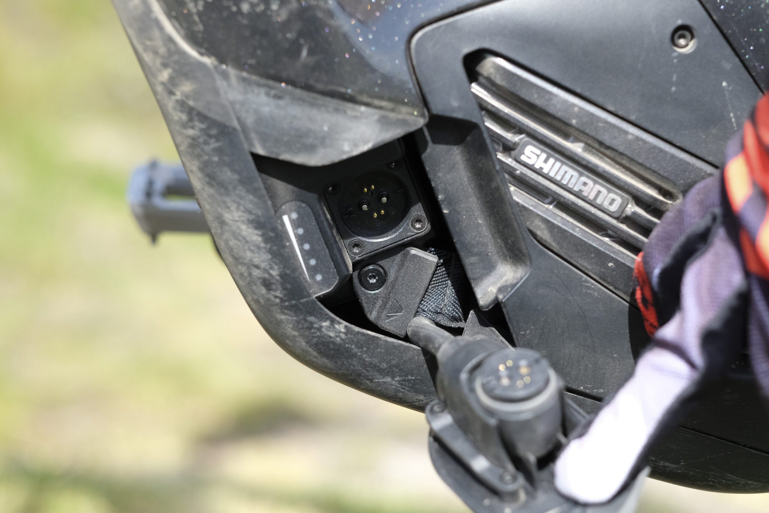 The Shimano power connector is streets ahead of the Bosch version – it’s a nice clean head without too many pokey bits, and a magnet to help clunk things into place. However, its position on the Canyon Spectral:ON is quite tight. For charging, it’s quite easy to get the connectors in place, however to connect the bike up to the battery again afterwards lacks the reassuring ‘thunk’ I’m looking for. Possibly my connector cable had been cut a bit long, but it seemed to push the head and attached cover away from the bike rather than neatly fitting together. I did a fair amount of trying to reroute the cable around the battery and motor within the confines of the cover, but ultimately nothing made it sit really neatly. The cover is mostly aesthetic, but it’s annoying to have unnecessary faff to deal with.