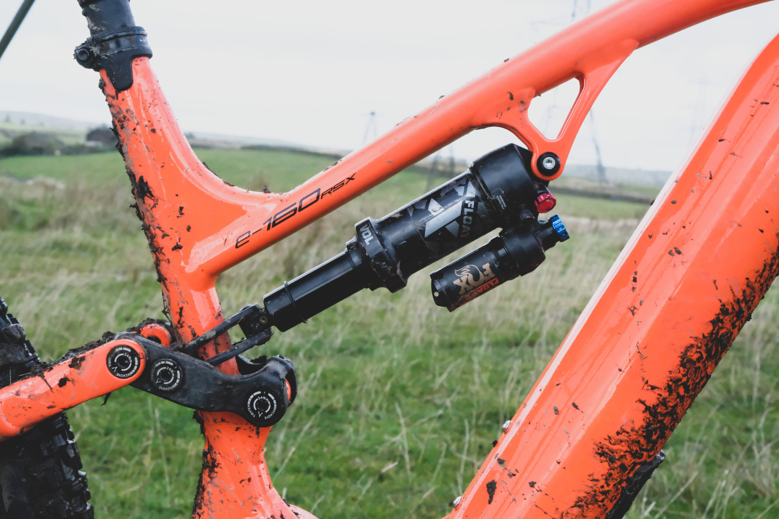 Although it’s called the E-160, the frame actually offers 150mm of rear travel. It’s the fork travel that gives the bike model its name. The fork in this instance is a fat legged Fox 38 Performance Elite with Grip2 damper.