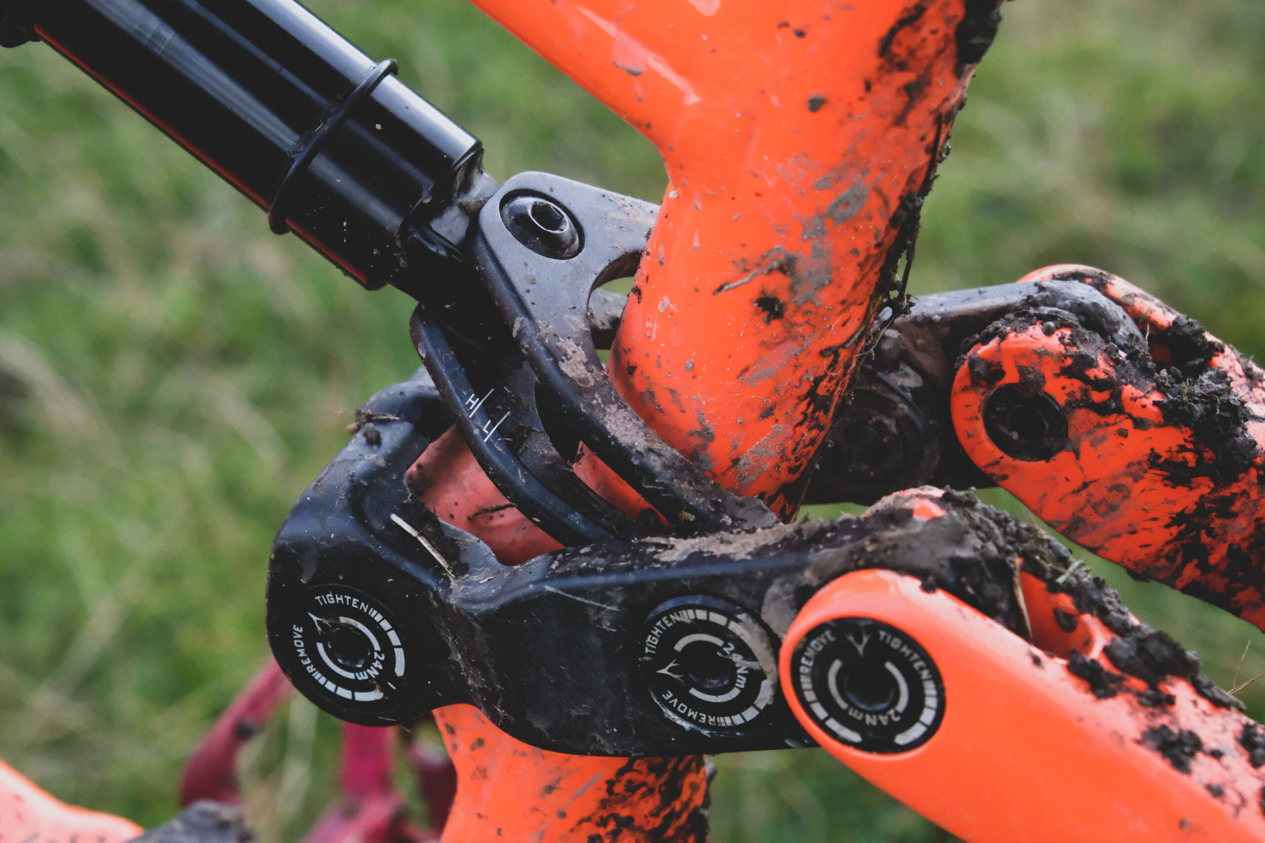 The other important things are well covered on this bike. Great brakes. Decent tyres. Capable geometry. Speaking of which, there is a flip chip built into the linkage yoke for geo tweaks: really low BB, or insanely low BB.