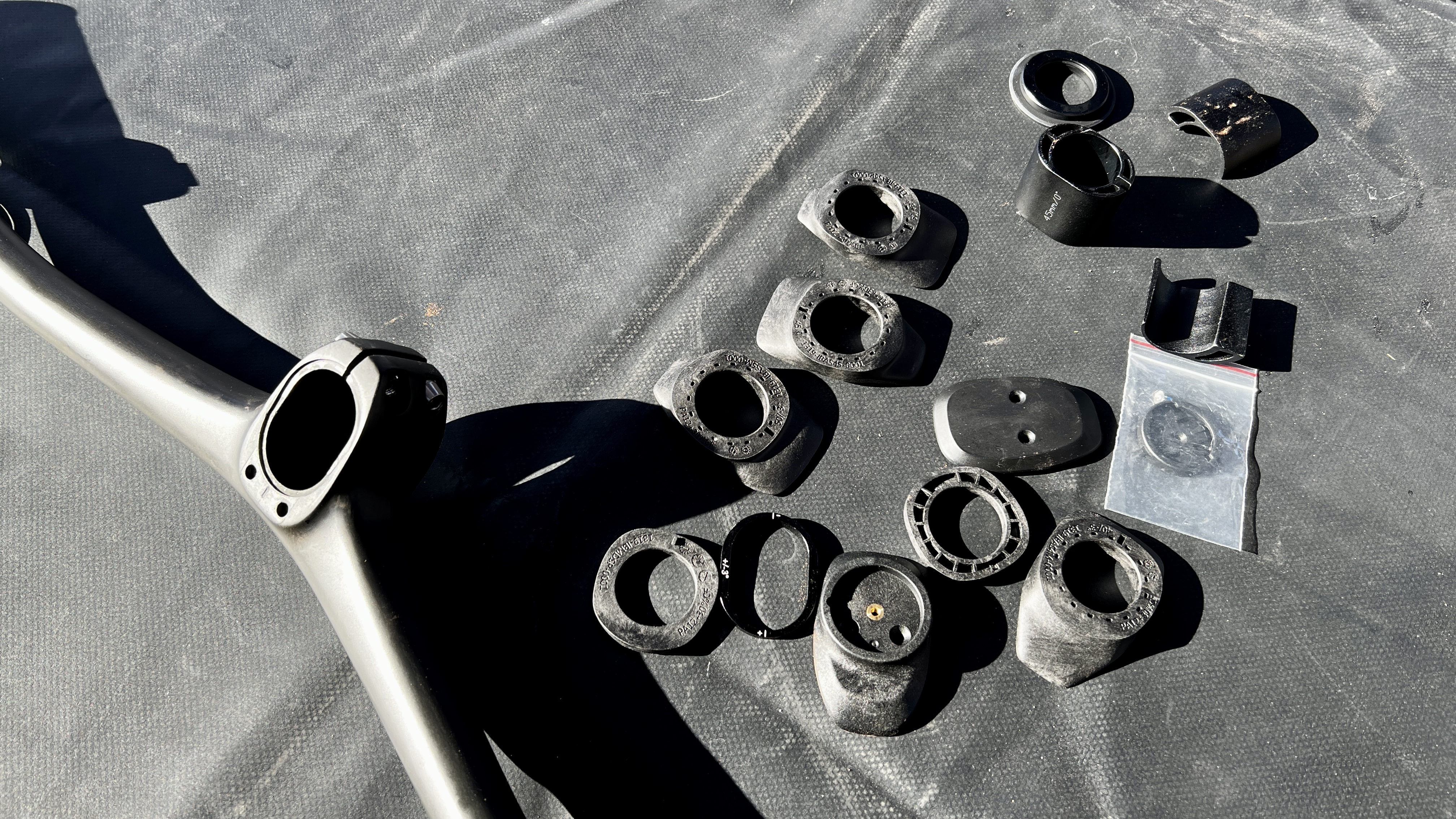 This bar/stem component uses a series of shims to adjust not only the stem length from 40 – 50mm but also the roll of the bar too. I laid out the shims that come with the bike and there’s a grand total of 14 shims that will allow you to make whatever adjustments you prefer. It’s not exactly tweekable out on the trail (In fact it really isn’t) but once you have your configuration set, you really shouldn’t need to fanny about with it again. It all adds to the lightweight package and it certainly deals with the intrinsic adjustment limitations of a standard one piece cockpit to a certain degree (pun intended).