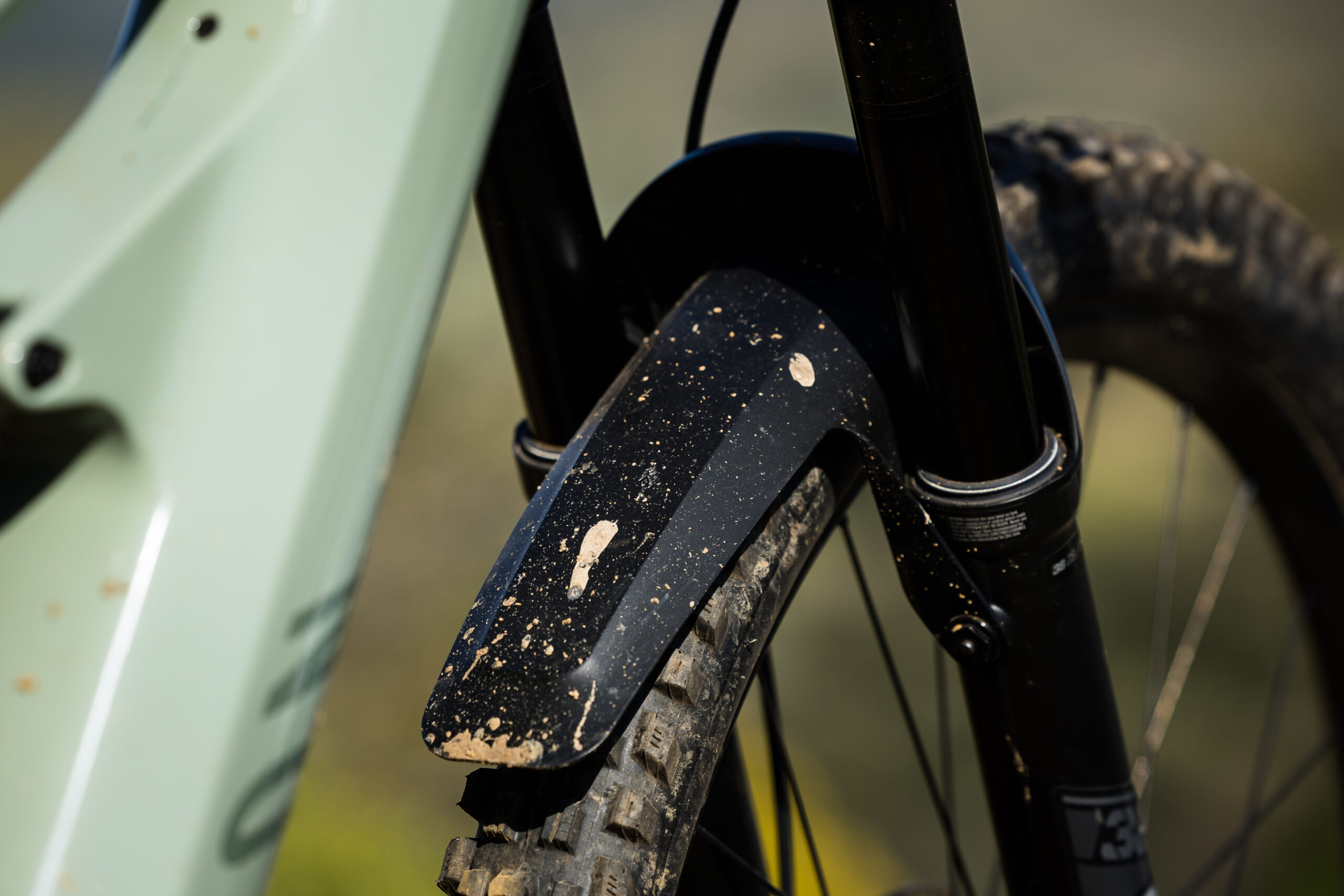 The bike comes with shorter than usual 165mm cranks – ebike climbing technique involves keeping pedalling, while dragging the rear brake while pedalling if you need to modulate the speed. Shorter cranks help keep things turning on the rockiest of climbs, avoiding the need for a half crank or pause. I still clipped the pedals on occasion, but that’s probably testament to the terrain I was riding on rather than the bike’s geometry. If I were keeping this bike, I’d likely chop the bars down a bit, to give myself a bit more power over the front when popping off lips and jumps. The underside of the bike is inspired by motocross, designed to slide over obstacles and protect the chainring. A front mudguard on the fork keeps the worst of the mud from your face.