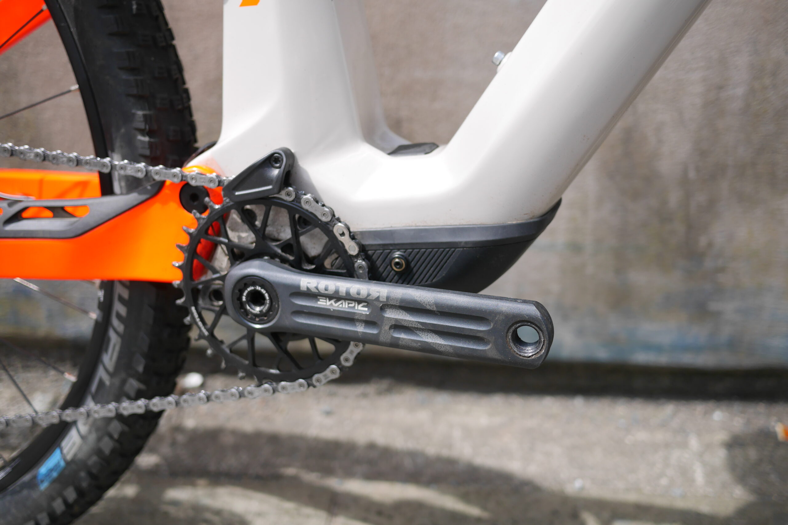 There are bottle bosses in a normal place and can accept proper capacity water bottles. Below the bosses, nearer the seat tube junction, is the charging port which was great. Easy and positive to use and impressively water ressitant. The chainstay protection is nicely designed and adhered. The thru-headset cabling is a shame. When will this disappear into the history bin of bad bike ideas?