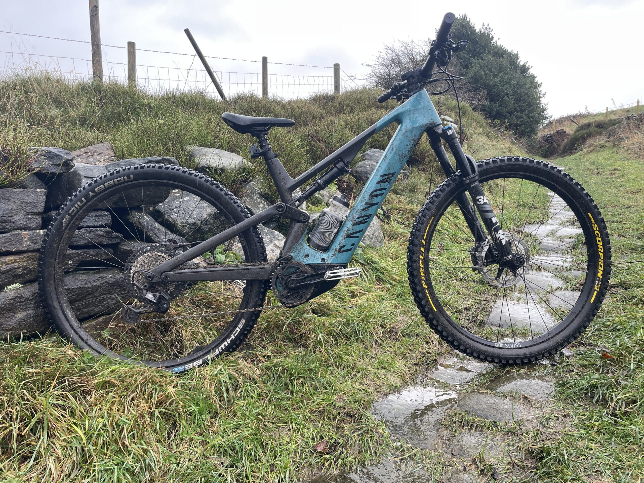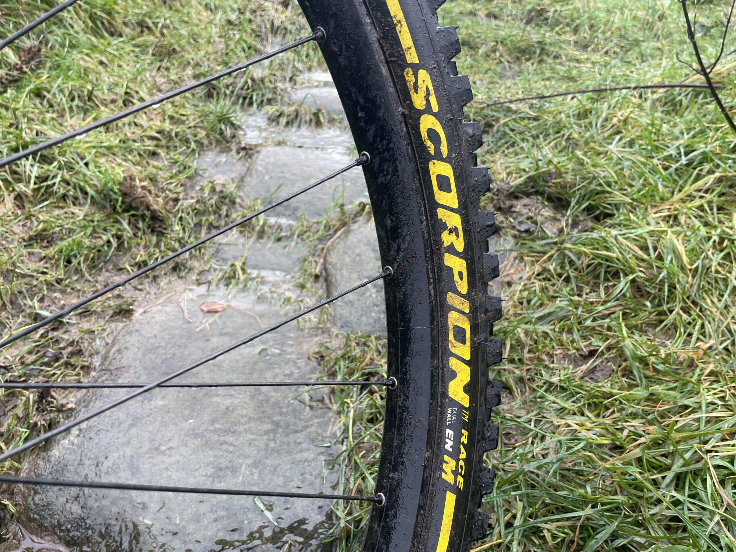 It comes shod with some rather inadequate Schwalbe blue (Addix Speedgrip) compound Nobby Nic tyres. This blue rubber compound is to my mind too slippery for confident handling in most UK conditions. I swapped the front tyre out for a super grippy (but less hard wearing) Pirelli Scorpion Enduro Race tyre. With stacks of grip up front, I left the more slippery but durable Nobby Nic on the back. If you buy this bike, you should at least budget for an alternative front tyre, unless you live somewhere very dry and have free healthcare.