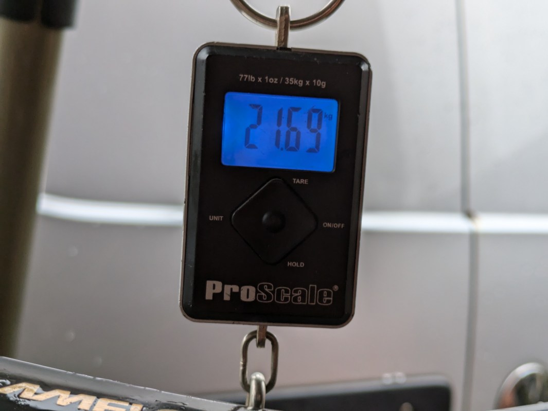 Overall bike weight. I rode the Amflow Carbon PL Pro with heftier tyres (Continental Kryptotal Super Soft DH), a front mudguard and DMR Vault flat pedals. On my scales, this Large size weighed in at 21.69kg. A 600Wh battery version would have been 20.82kg FWIW. This is pretty close to my ideal bike (of any sort) handling weight of 20kg.