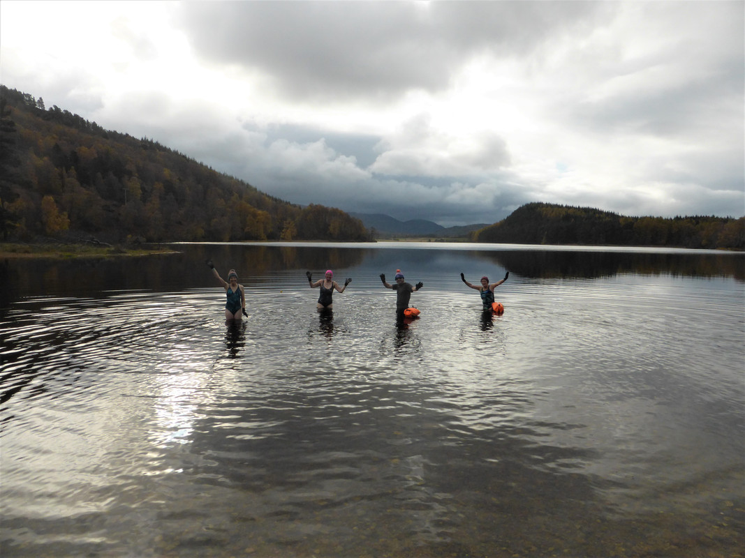 Wednesday morning was a 35 minute swim in Loch Vaa. Water temperatures around 9-10 degrees and still wearing a suit at this time of year. The crannog is now sticking out of the water and so is easy to find.