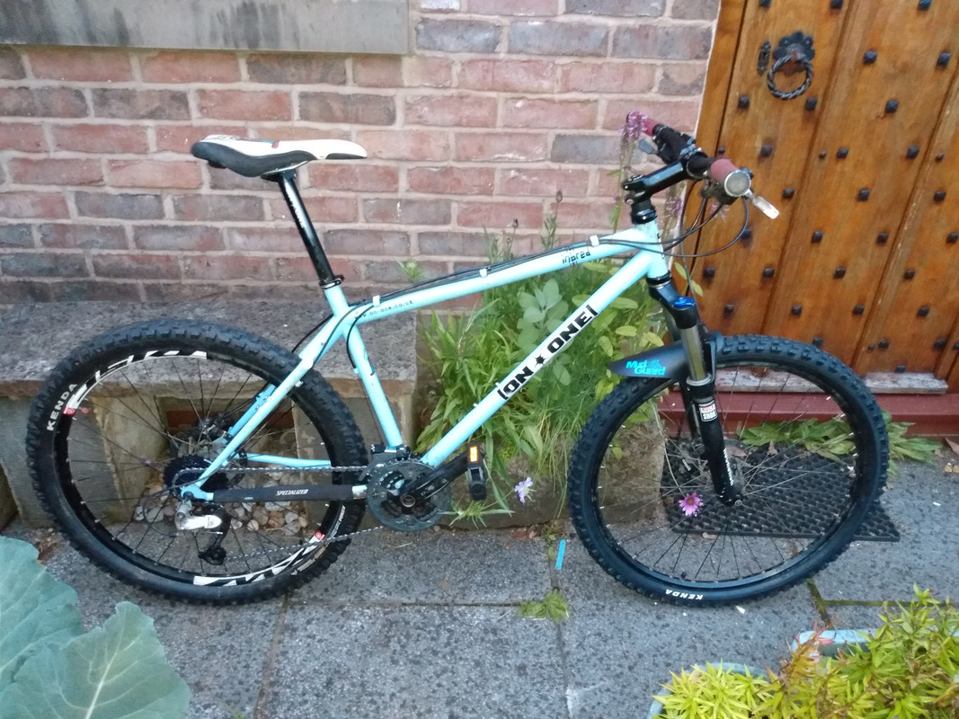 15 inch Giant Arete with Reba fork and 11 speed SLX bought off ebay for £130. Its a lovely bike.Eldest is adult sized 15 year old and has a medium Whyte 603 built up from frame, the parts bin, Ebay and mates spares. I’ve actually ridden this bike and its loads better than shite I had in the 90s that was top end!
