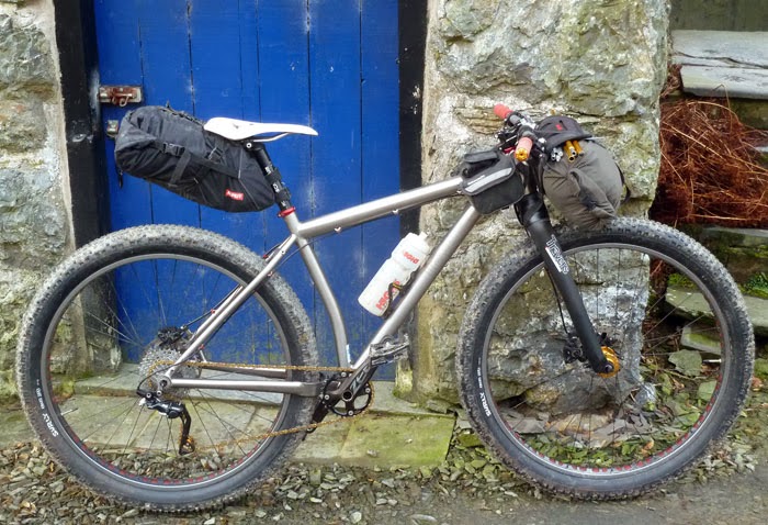 Now using an Alpkit Possum for this kind of bike, this was a cobble-together with my MTB kit and a cheap ebay frame bag. Worked fine.
