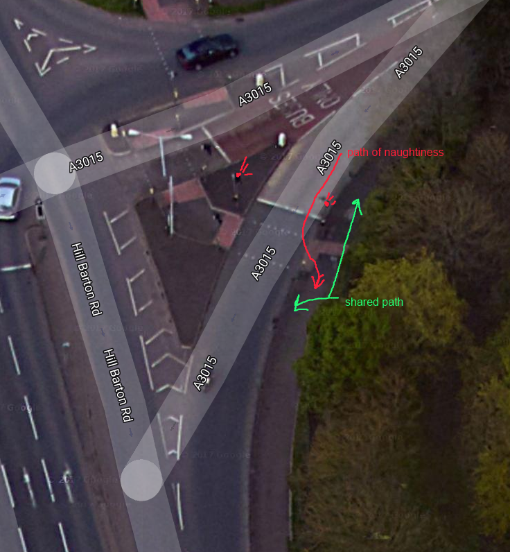 Rider would be approaching on the A3015 on the road*, and then joins the shared path at the red lights (crossing the line to do so as dropped kerb only at red section/crossing), and incurs the wrath of shouty person in car also stopped at the lights. For clarity there are no other pedestrians or cyclists in the vicinity of the crossing.