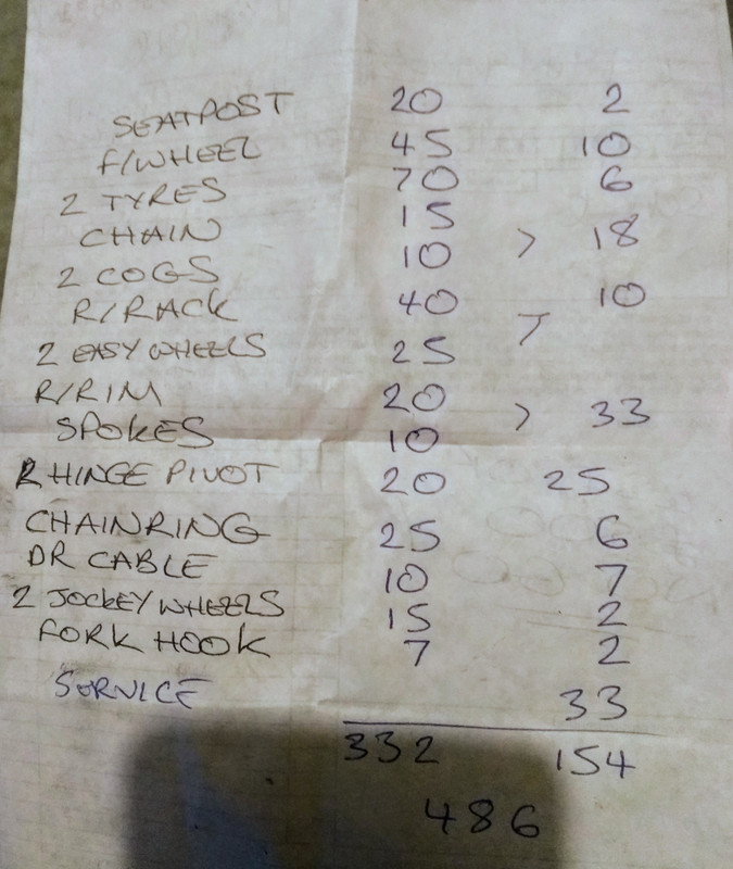 From that its not as knackered as I thought, that's mostly consumable stuff that adds up. Not sure I can rebuild a rear wheel, or sort the rear pivot but everything else is do-able by me. Seatpost, tyres, front hook are all OK - will need replacing at some point but OK for now.