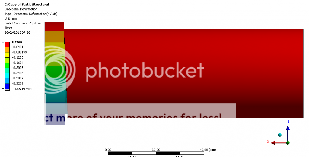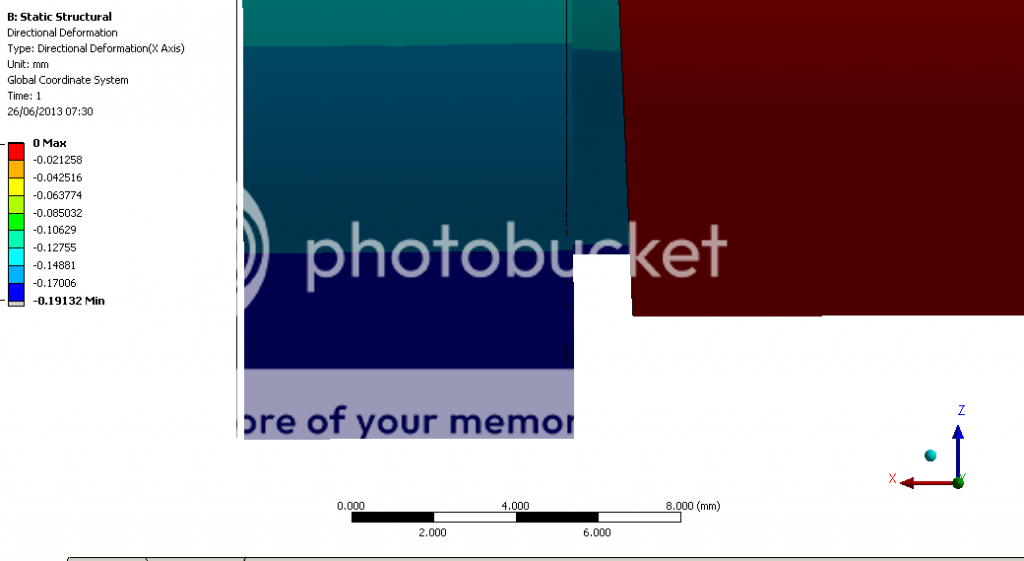 6) I have modeled the bearing as 100gpa, essentially half the stiffness of steel, to try and account for the fact that my simple representation fo the bearing (28.575 x 41 x 6.5) is a solid ring, so probs half of it is fresh air, so approximation is half the stiffness of steel.The load is applied to the bearing face in the negative x direction - ie towards the right hand side of the screen.