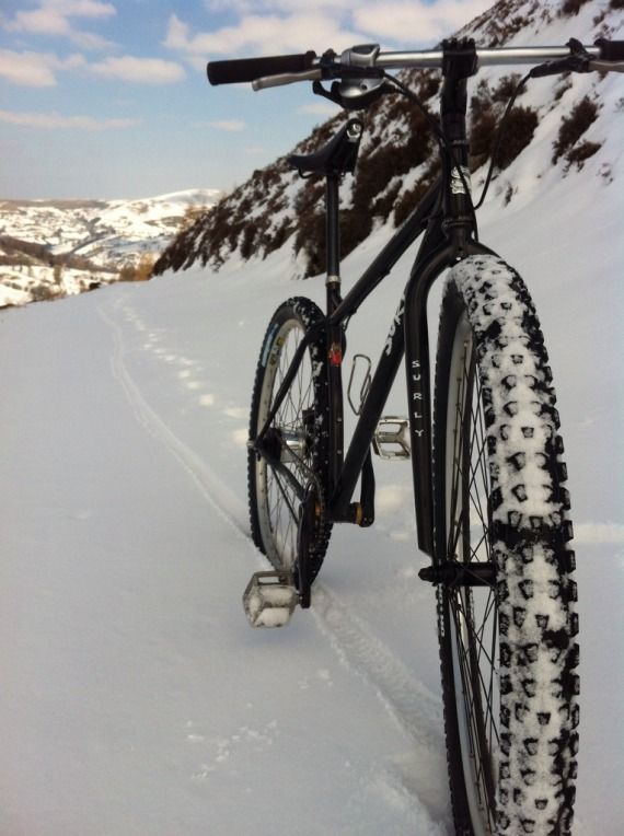 I was out on my karate monkey running 2.4 front and 2.3 rear tyres, dropped psi down to 16psi and had loads of grip and traction. The bike rode perfectly on compacted snow and up to about 5-6" deep but it was hard going. The snow wasn't all powdery quite firm with a frozen top.