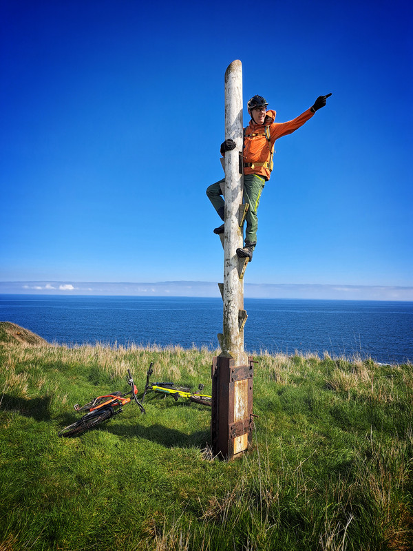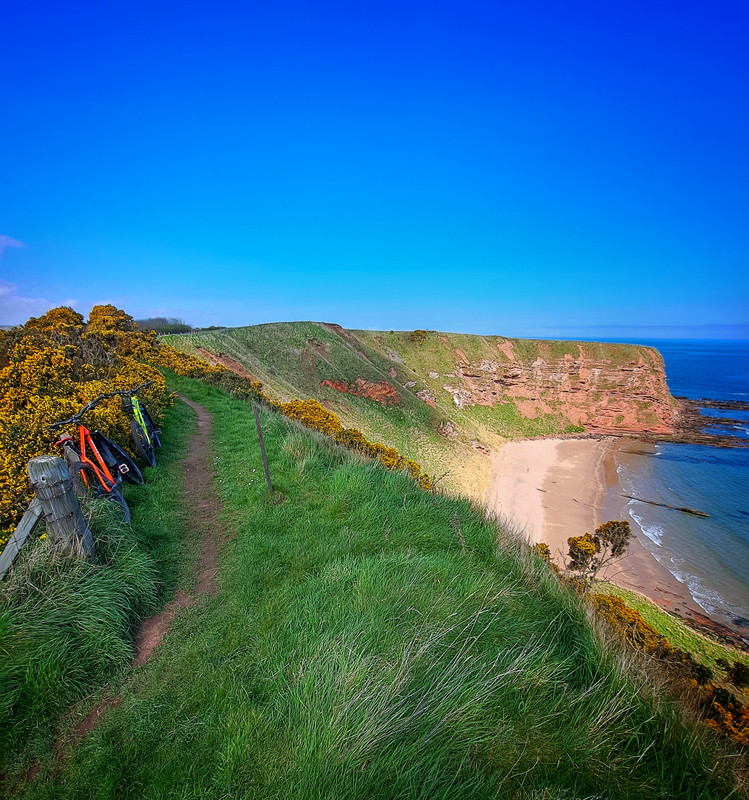 Weather looked promising so we jumped in the van early Saturday morning and pootled over to Cockburnspath to complete the last leg. We made a loop - headed out on back roads to pick up the SUW at Whiteburn Farm before an undulating saunter across farmland brought us to an "exhilarating" dash across the A1 trunk road and a climb up through Penmanshiel forest. There appears to be loads of tasty looking steep trails cut in this wood - anybody ride here? A new logging access road suggests they may disappear shortly.