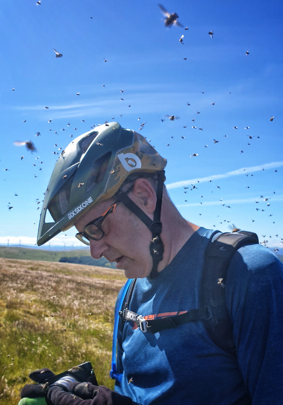 They started appearing about 4km into the (8km) climb and then the swarm just got larger until there were hundreds. If we stopped momentarily then you immediately had a seething carpet of flies covering your helmet, backpack, gloves, bars. We both had Smidge on so they never seemed to want to land on our skin - just everywhere else.