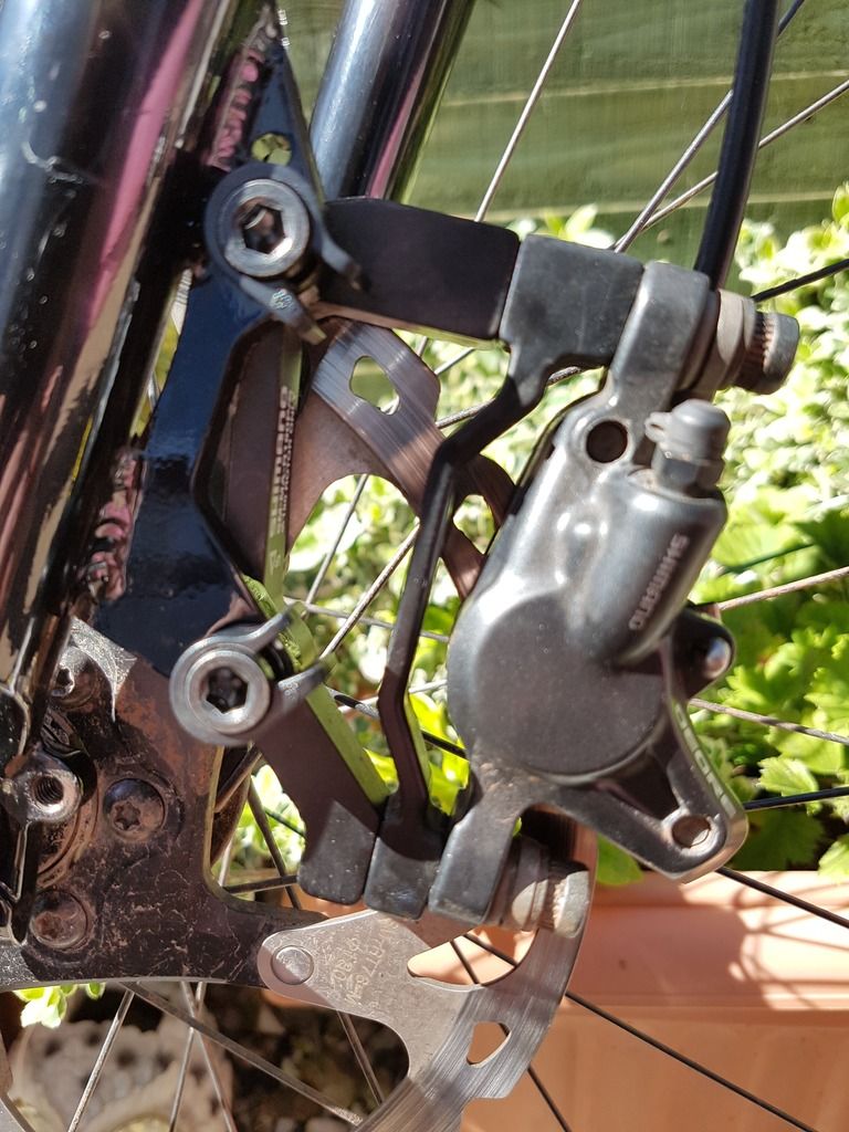 It is a rear adapter fitted upside-down, then a front post-2-post fixed into it, then the caliper. The pad seems to grab the disc fully, as it should. Morning commute did not show any problems (but it was all mainly rear braking - just in case). Is there any risk of instant death here?