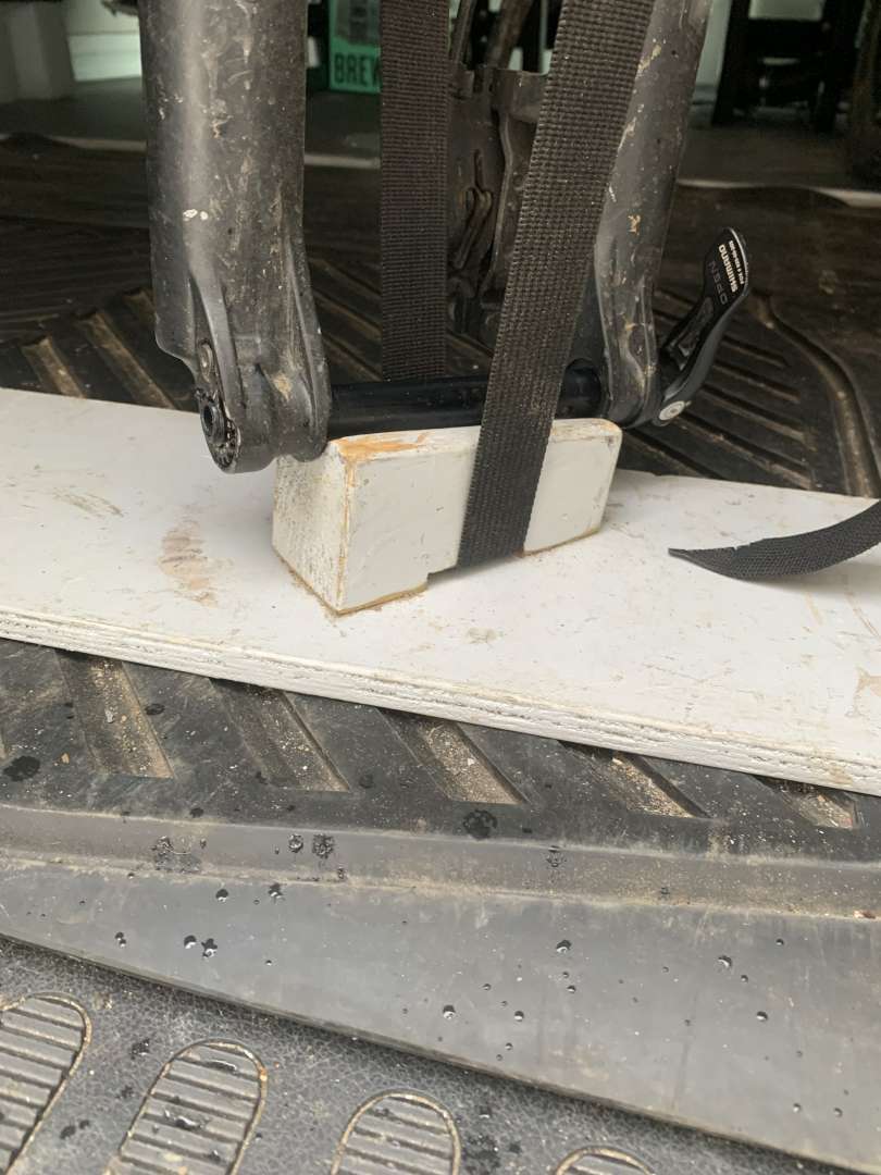 This works well in our van to minimize the overall height for increased bed space, while allowing quick setup. The mounting blocks are angled and beveled to reduce handlebar overlap. A single cam strap over the bar and under the block compresses the fork and provides a solid anchor (works with rigid forks to). The V notch on the block top takes 12-20mm axles and I have a dummy for QR forks. I made them out of soft wood and coated with epoxy for durability, but hardwood would work well. Two of the blocks are fixed to the plywood base and I have since made others that can float, depending on packing.