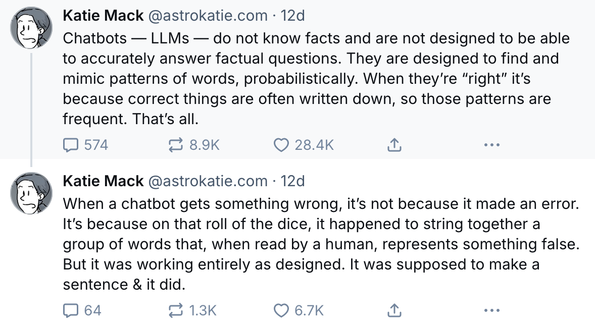 But which bits of that reply was ChatGPT making up or hallucinating? Colleague writing a clinical paper the other day asked ChatGPT out of interest, and it was making up references with good sounding titles and journal DOI numbers. RFK Jr presented his new vaccine case report the other day, and a senator with an MD took him to task because half the refernces his recommendations were based on were pulled out of thin air - and RFK was changing national vaccine policy off the back of it.