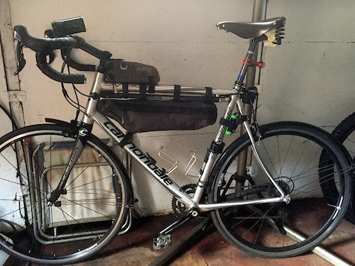 Alloy road bike on 25c. I used to ride this to work and all the road riding. I'd rather not go back to bouncing about on pot holes every day on the commute.