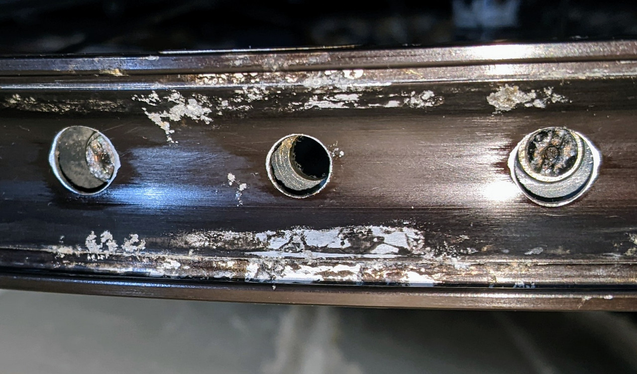 The corrosion is a bit worse on the rear wheel, around the valve hole mainly. Not deep but more of it.